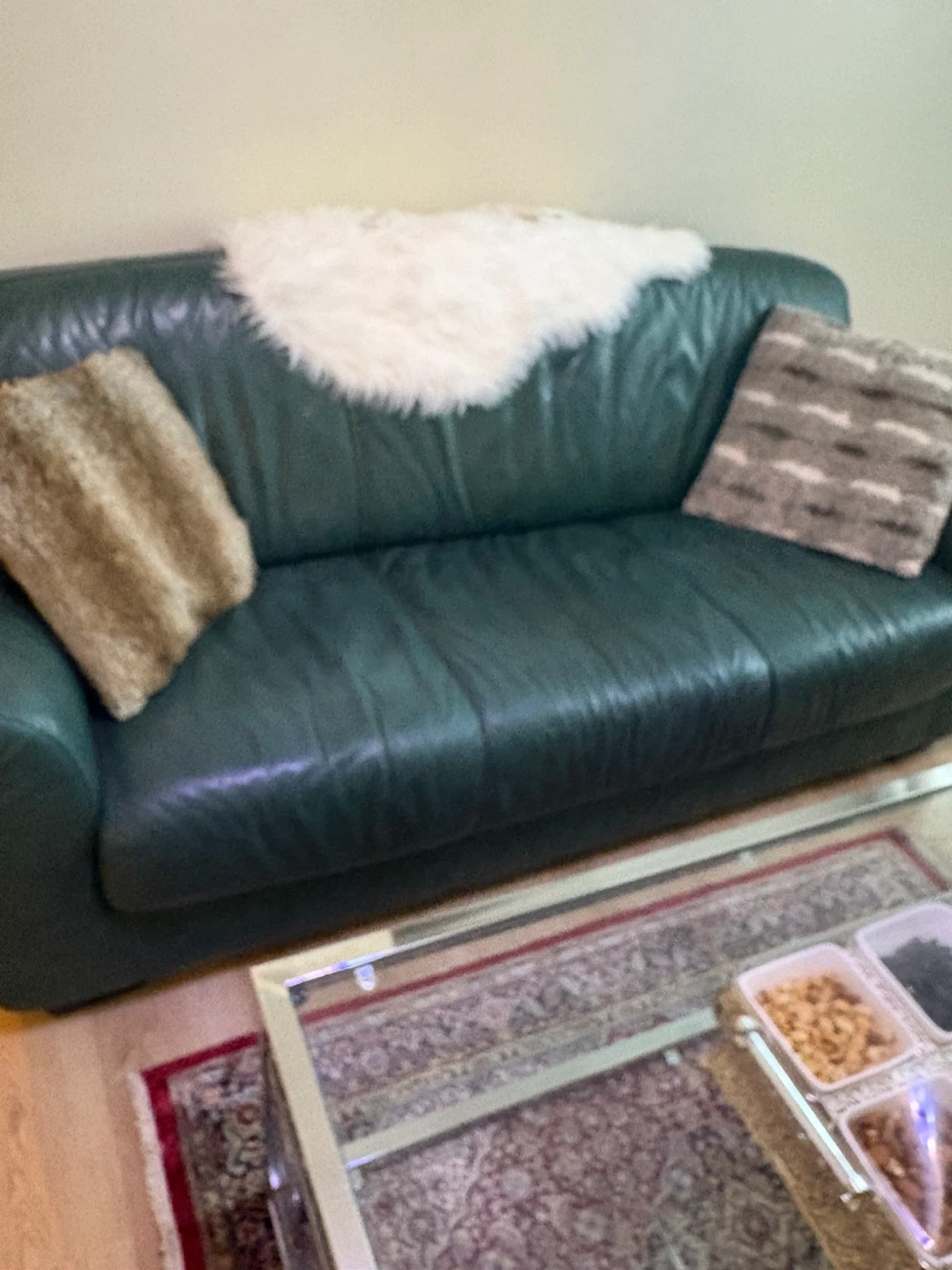 This is a comfortable leather sofa. It's a dark green colour with a padded seat. It's perfect for a living room.