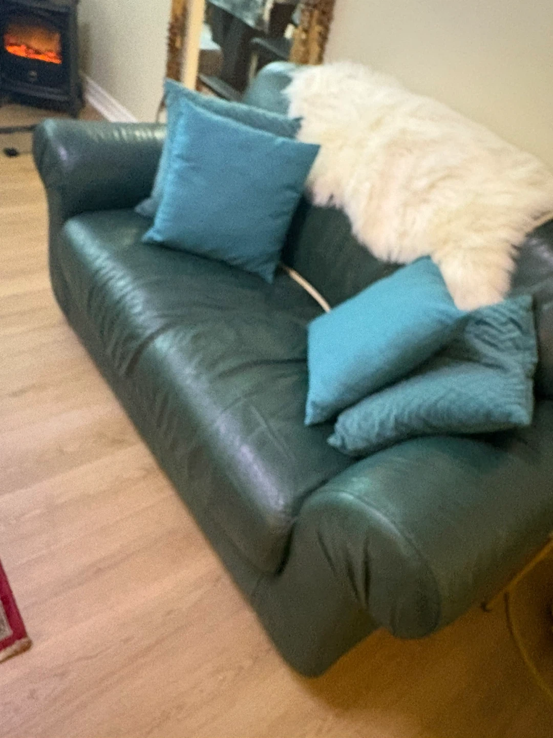 This is a comfortable leather sofa. It's a dark green colour with a padded seat. It's perfect for a living room.