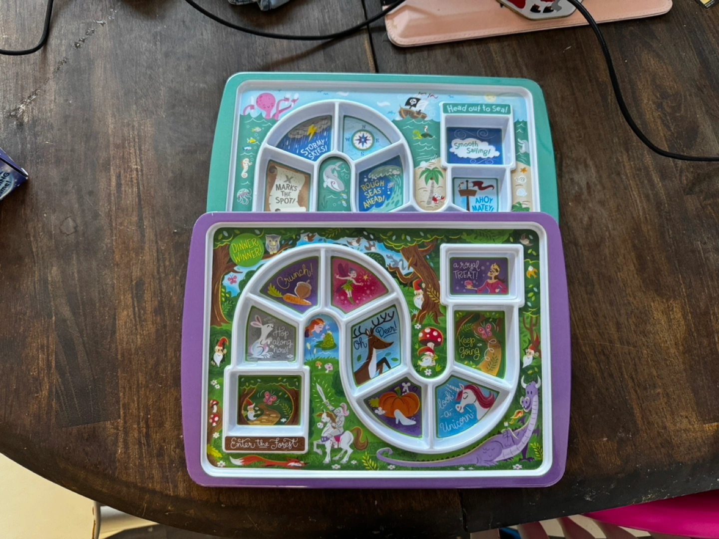 Two divided children's plates. One features a fairytale theme, the other a nautical theme. Fun and colourful designs. Dishwasher safe, not microwave safe. Made in China.