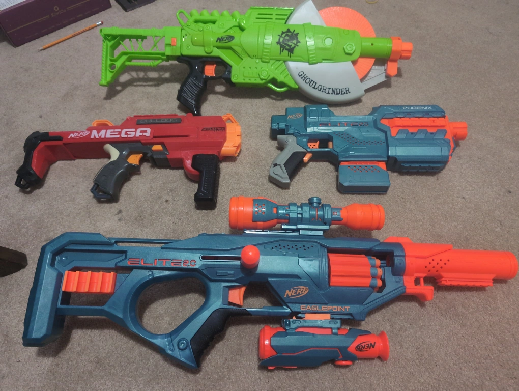 Selling a collection of Nerf blasters! Included are the Ghoulgrinder, Mega Bulldog, Phoenix, and Elite 2.0 Eaglepoint. Great for some fun target practice or Nerf wars with friends and family