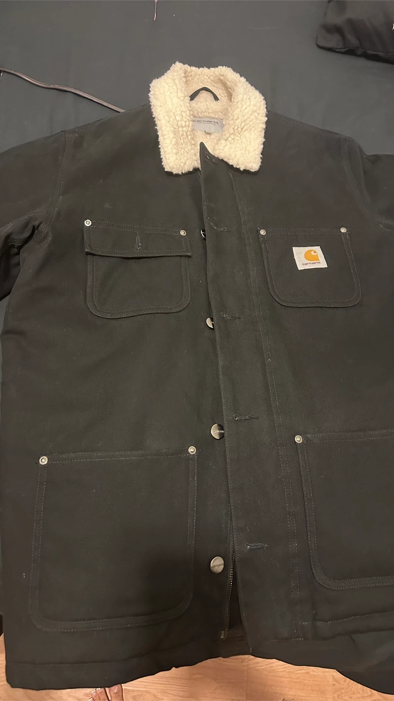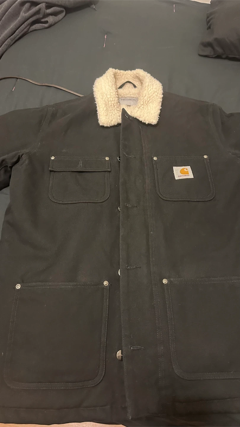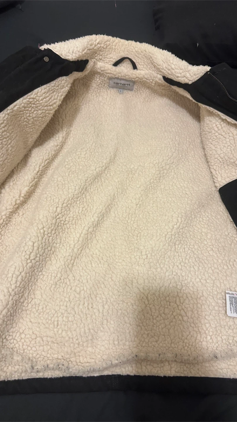I'm selling a Carhartt Work In Progress jacket in black. It's a size small and features a cozy, sherpa-lined collar. Perfect for cooler weather!