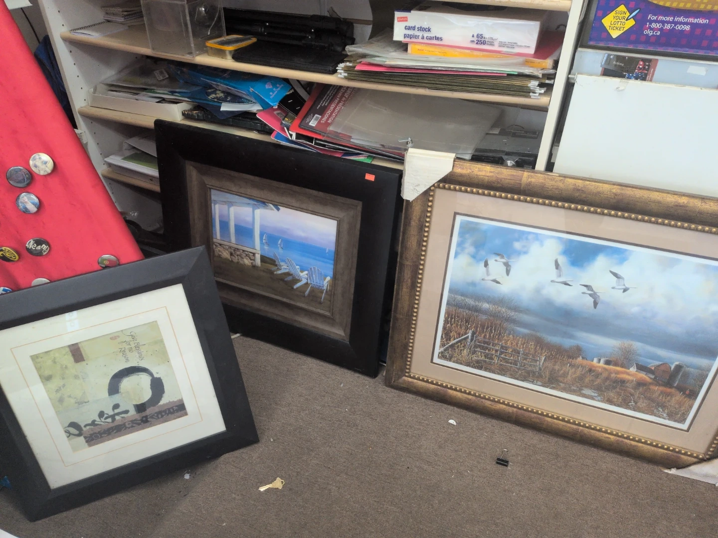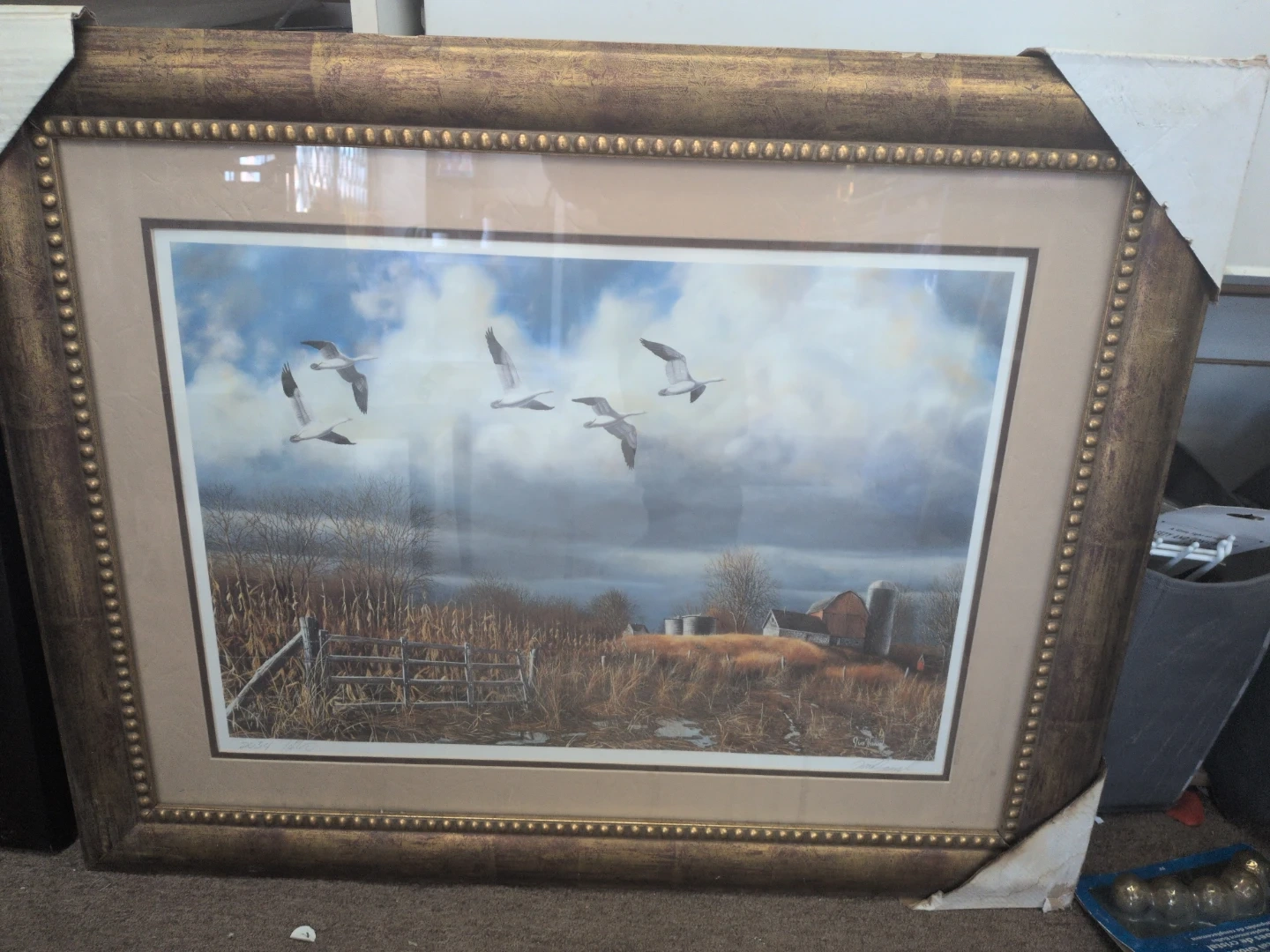 This framed print depicts geese flying over a rural farm landscape with a barn and fence. It's housed in an ornate gold-toned frame with beaded detailing. This piece adds a touch of nature to any room.