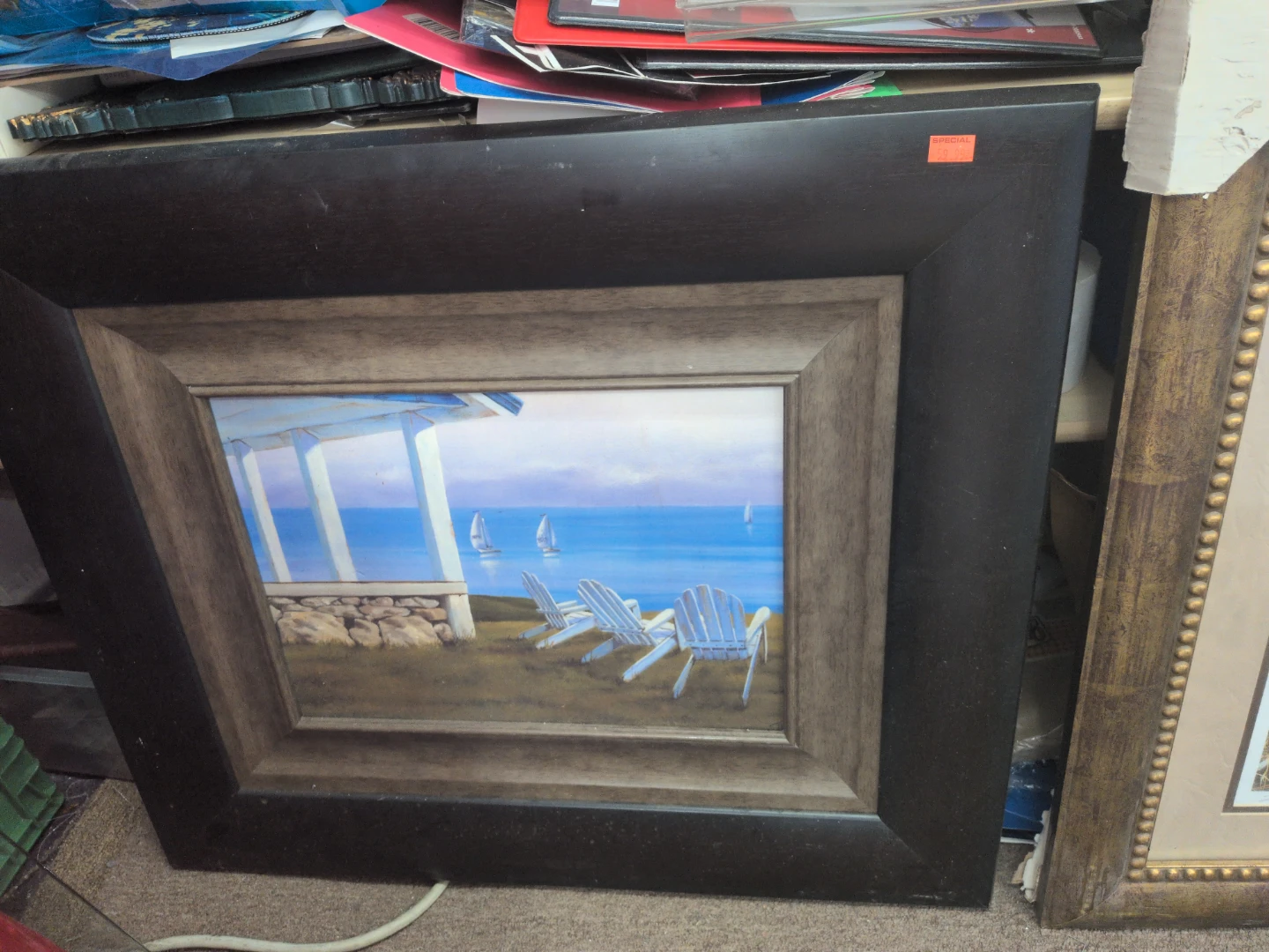 This framed print depicts geese flying over a rural farm landscape with a barn and fence. It's housed in an ornate gold-toned frame with beaded detailing. This piece adds a touch of nature to any room.