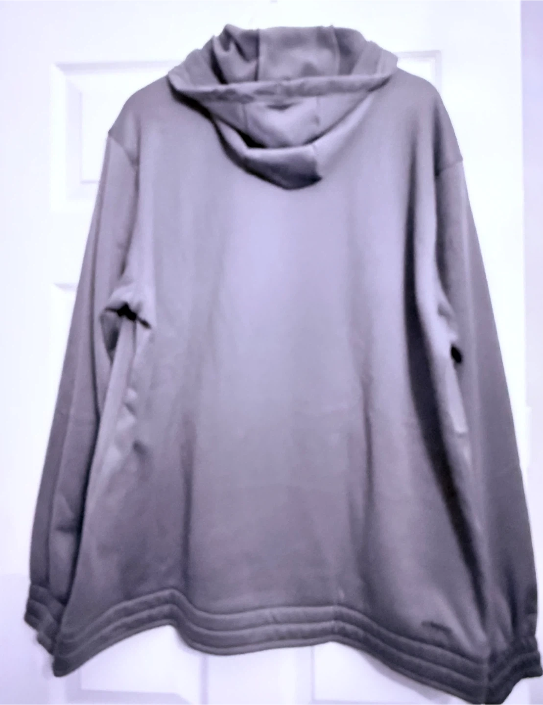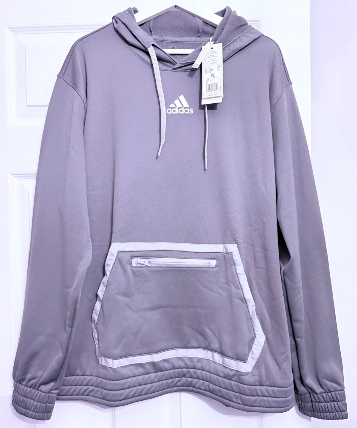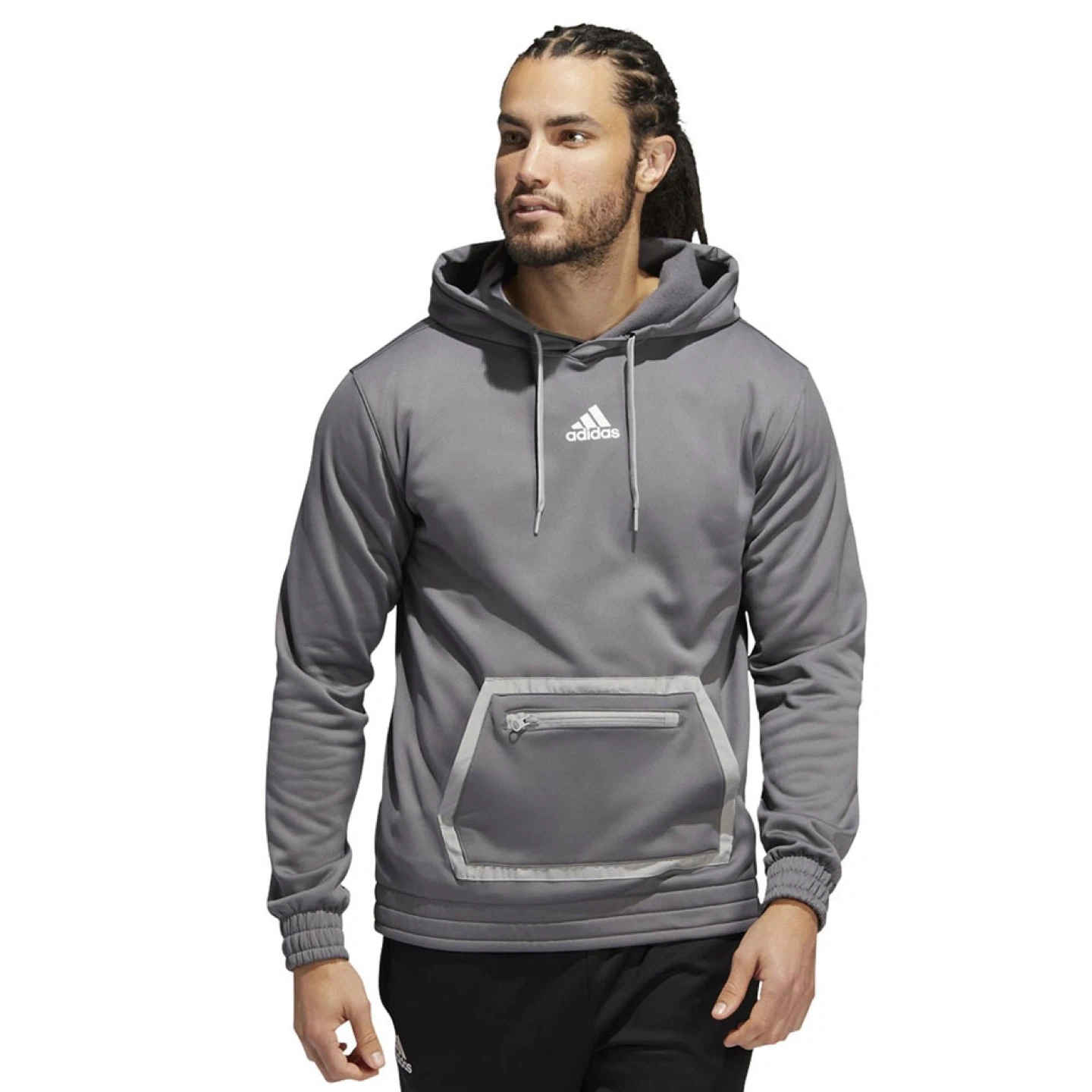 This is an Adidas Men's Team Hoodie in grey. It's made with AEROREADY fabric to keep you dry. Features a front kangaroo pocket with a zippered section.