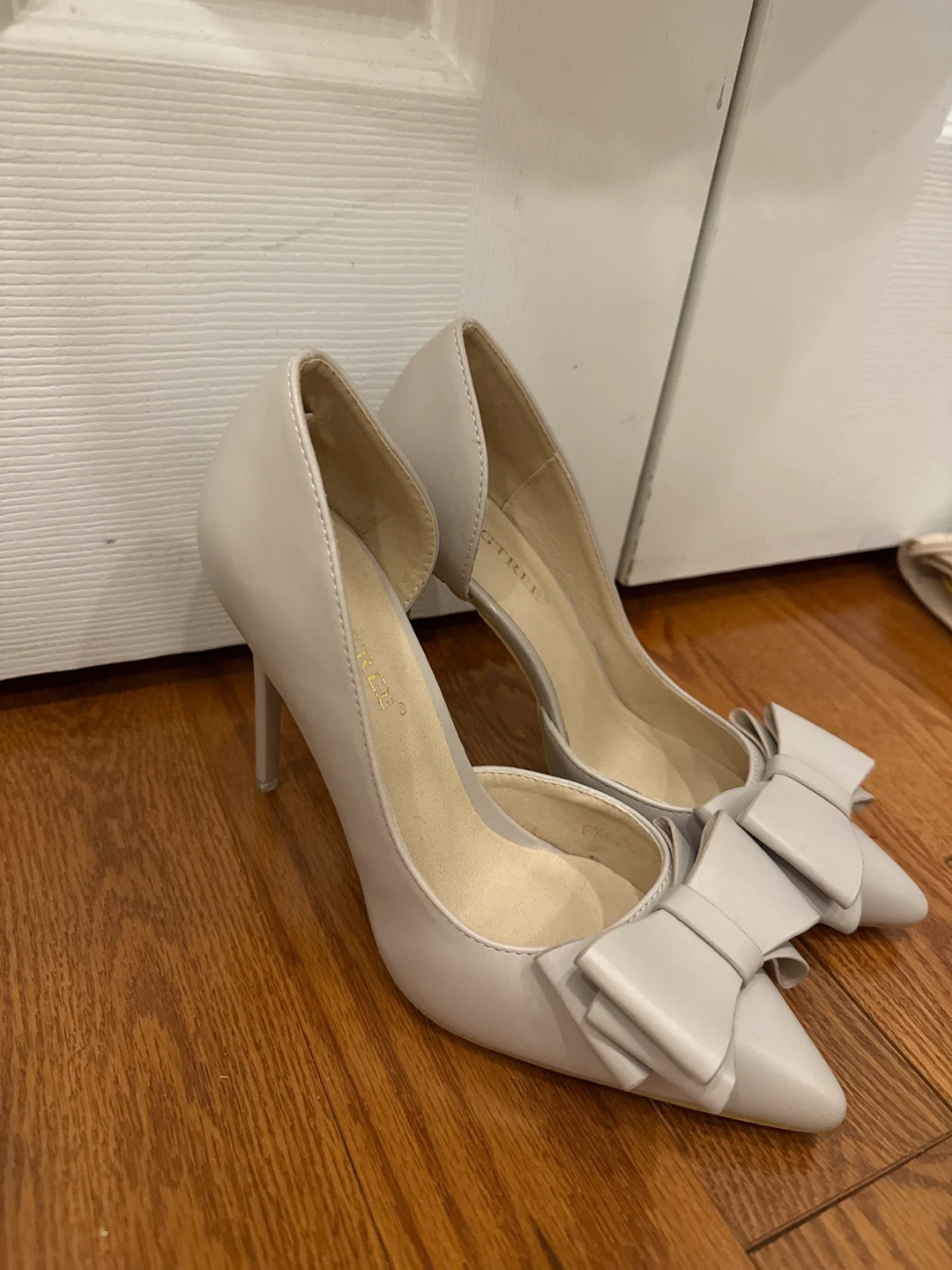 Cute light beige pointed-toe heels with a decorative bow accent. These pumps have a stiletto heel and a side cut-out design. Perfect for dressing up an outfit!