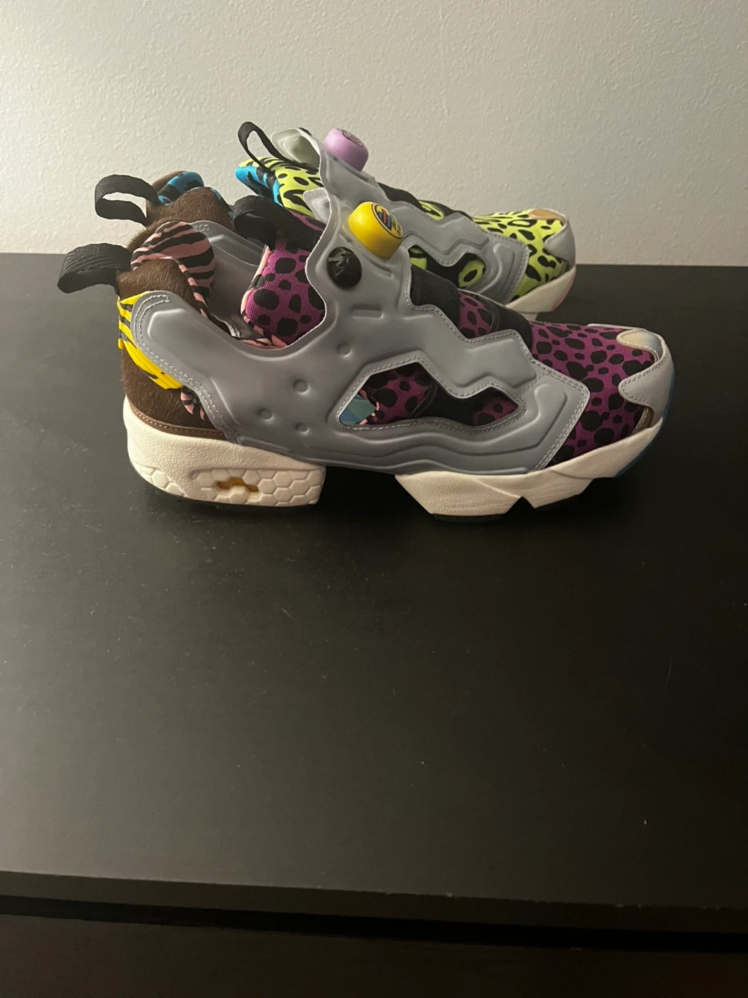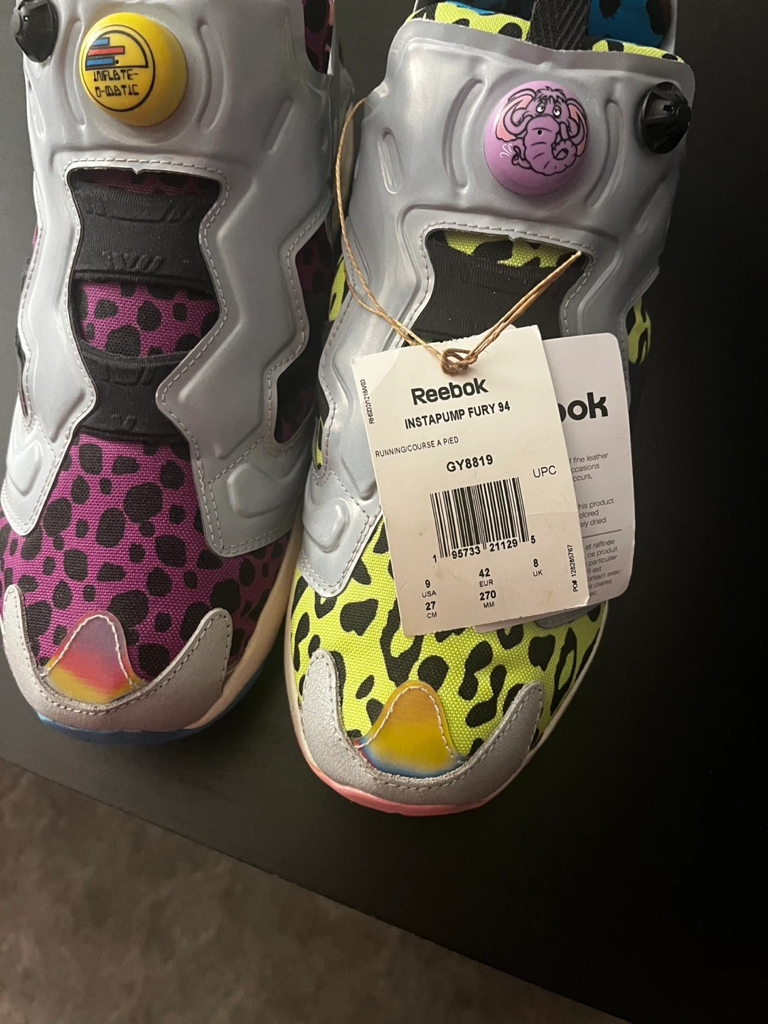 These eye-catching Reebok Instapump Fury 94 sneakers come in a size 9 MENS and feature a vibrant "Flintstones meet the Jetsons" design. The bold print includes leopard and polka dot patterns. They utilize Reebok's signature Instapump technology for a custom fit. This pair showcases a unique blend of purple, neon green, and brown. And retails over $300