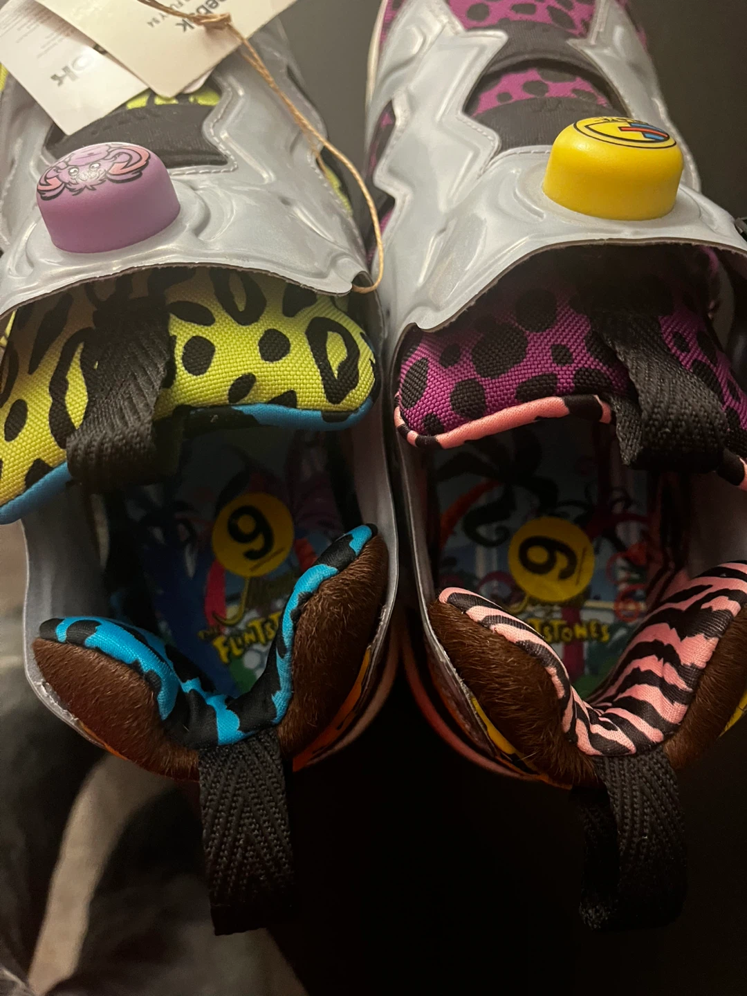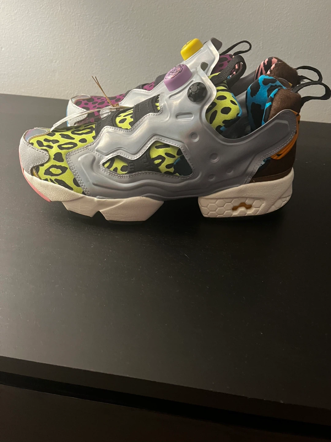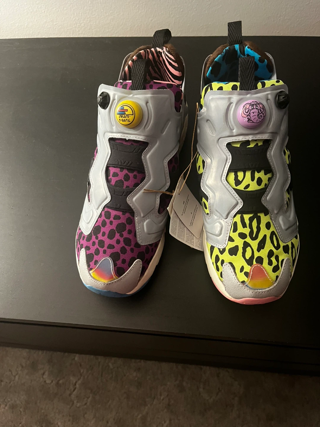 These eye-catching Reebok Instapump Fury 94 sneakers come in a size 9 MENS and feature a vibrant "Flintstones meet the Jetsons" design. The bold print includes leopard and polka dot patterns. They utilize Reebok's signature Instapump technology for a custom fit. This pair showcases a unique blend of purple, neon green, and brown. And retails over $300