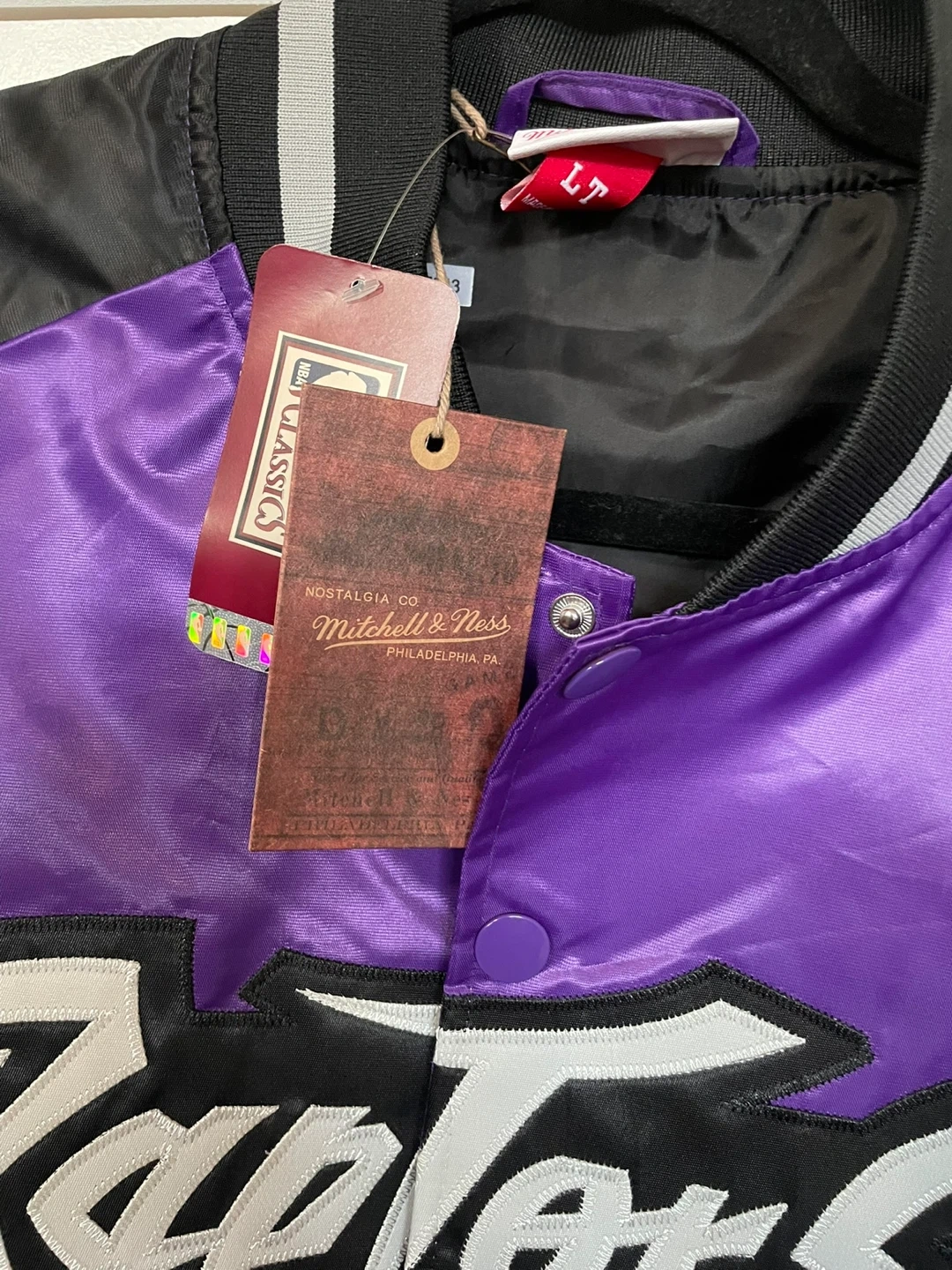 This is a Mitchell & Ness Toronto Raptors satin bomber jacket. It features the Raptors logo on the front and back with purple body and black sleeves. Includes original tags.