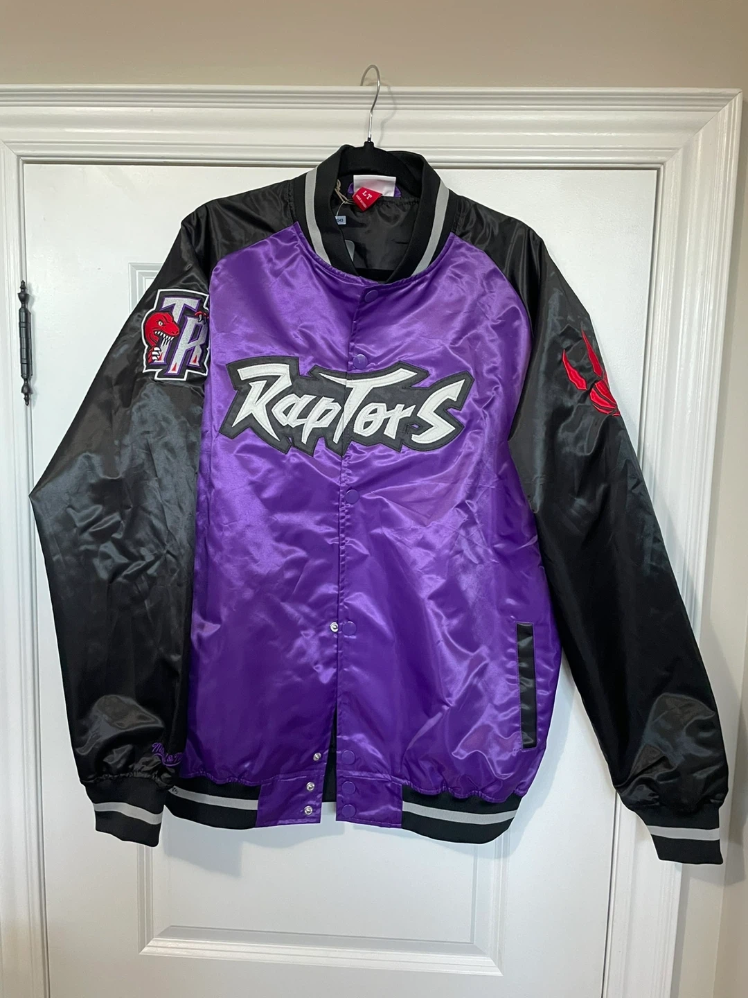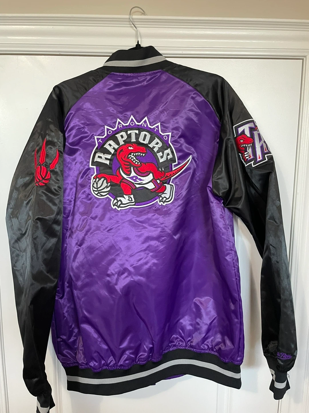This is a Mitchell & Ness Toronto Raptors satin bomber jacket. It features the Raptors logo on the front and back with purple body and black sleeves. Includes original tags.