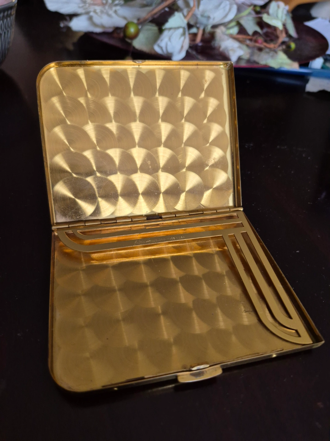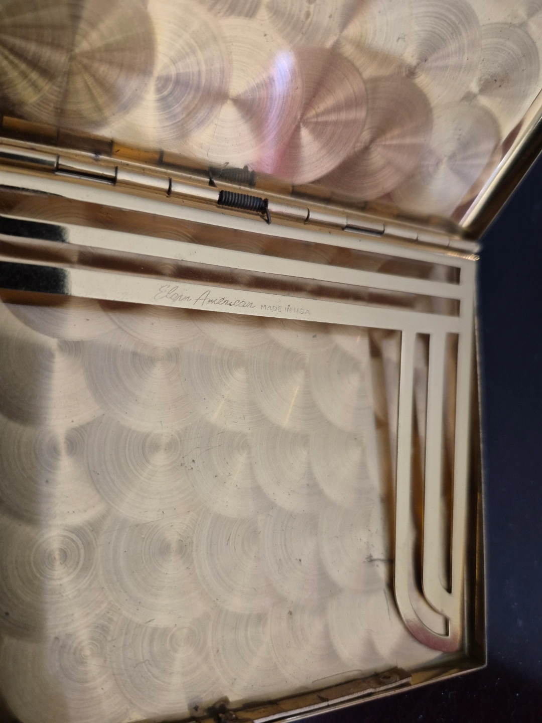Vintage Elgin American Brass Gold-toned cigarette case. Features an embossed pattern. Made in the USA. Shows some wear.