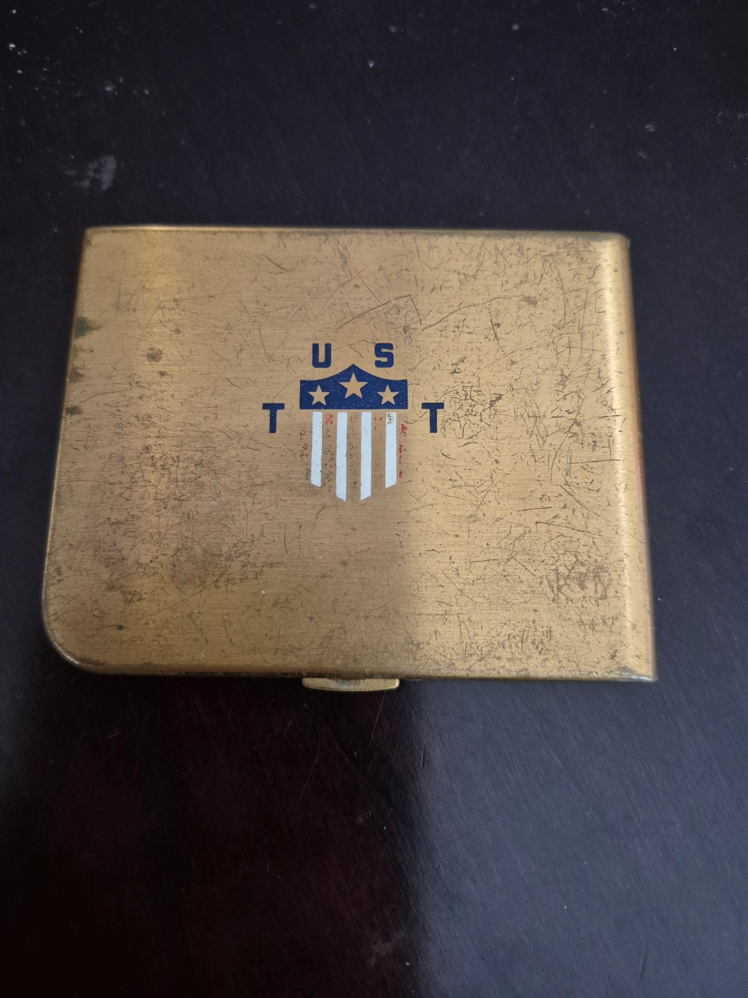 Vintage Elgin American Brass Gold-toned cigarette case. Features an embossed pattern. Made in the USA. Shows some wear.