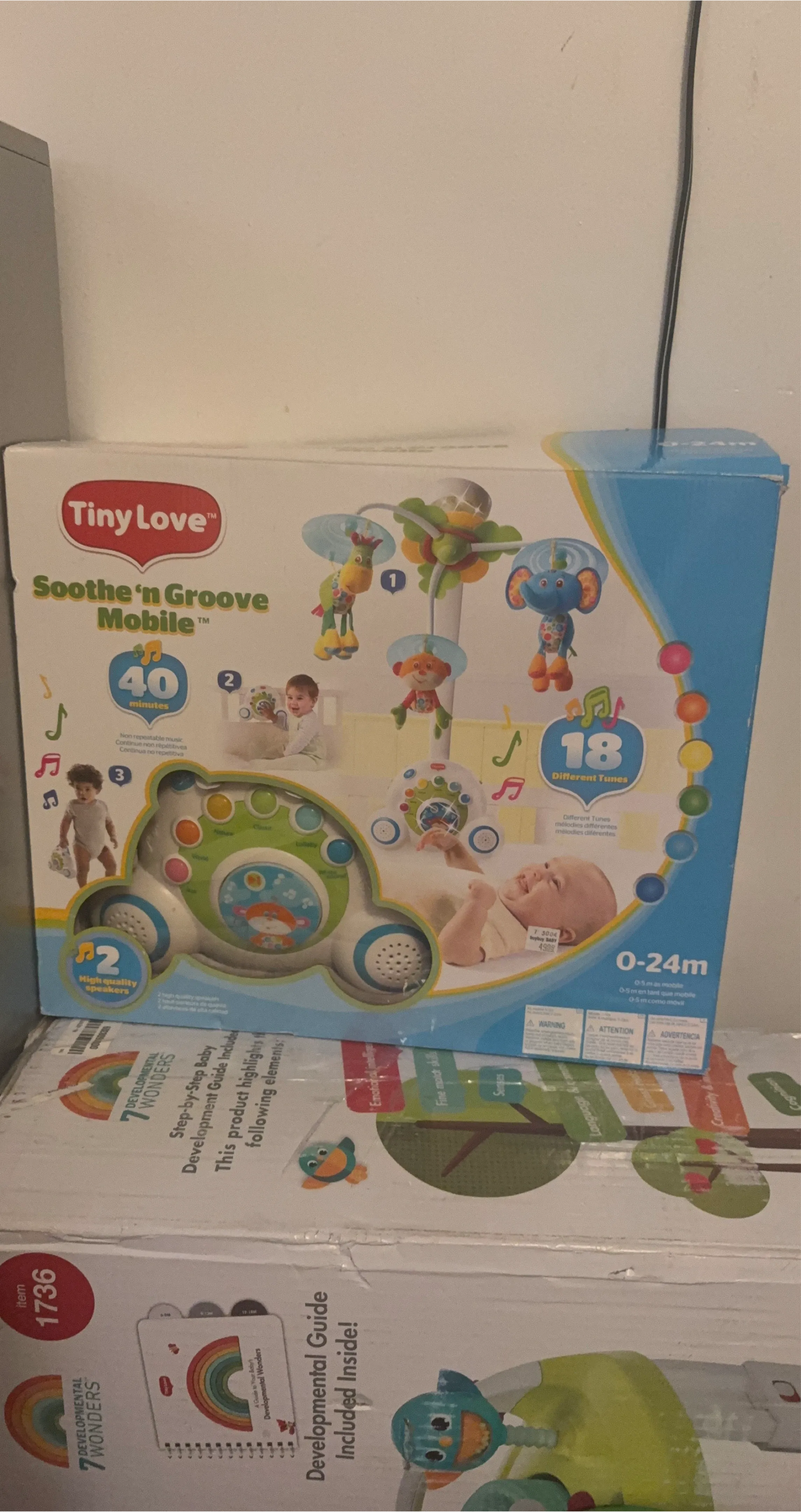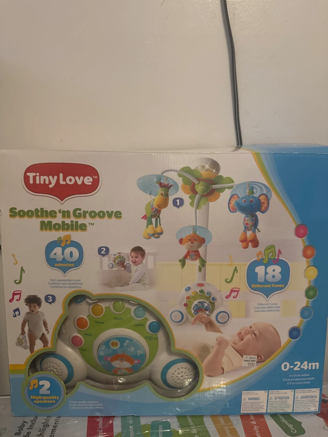 This Tiny Love Soothe 'n Groove Mobile features 18 different tunes and 40 minutes of continuous music. It includes high-quality speakers. Recommended for ages 0-24 months.