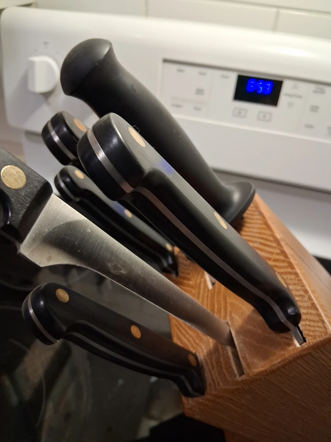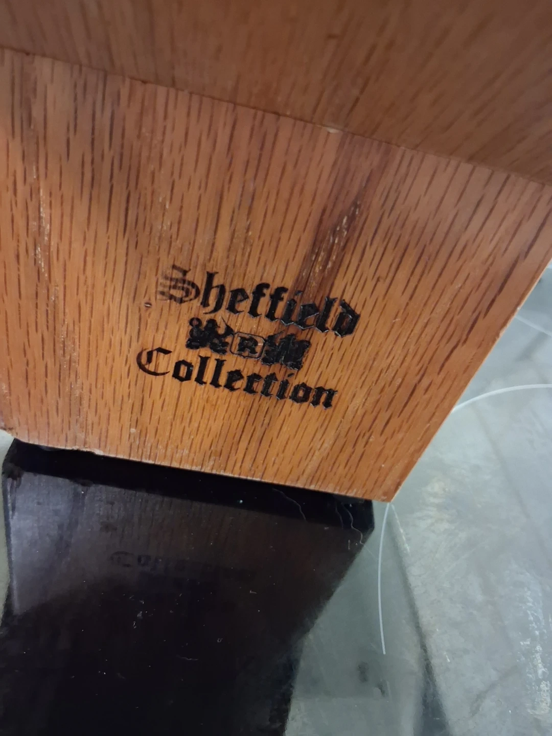 This is a knife set from the Sheffield Collection. It comes with a wooden block to store the knives. The handles are black with silver accents.