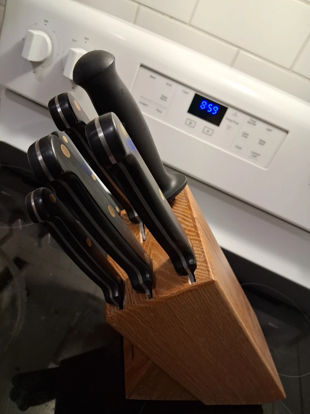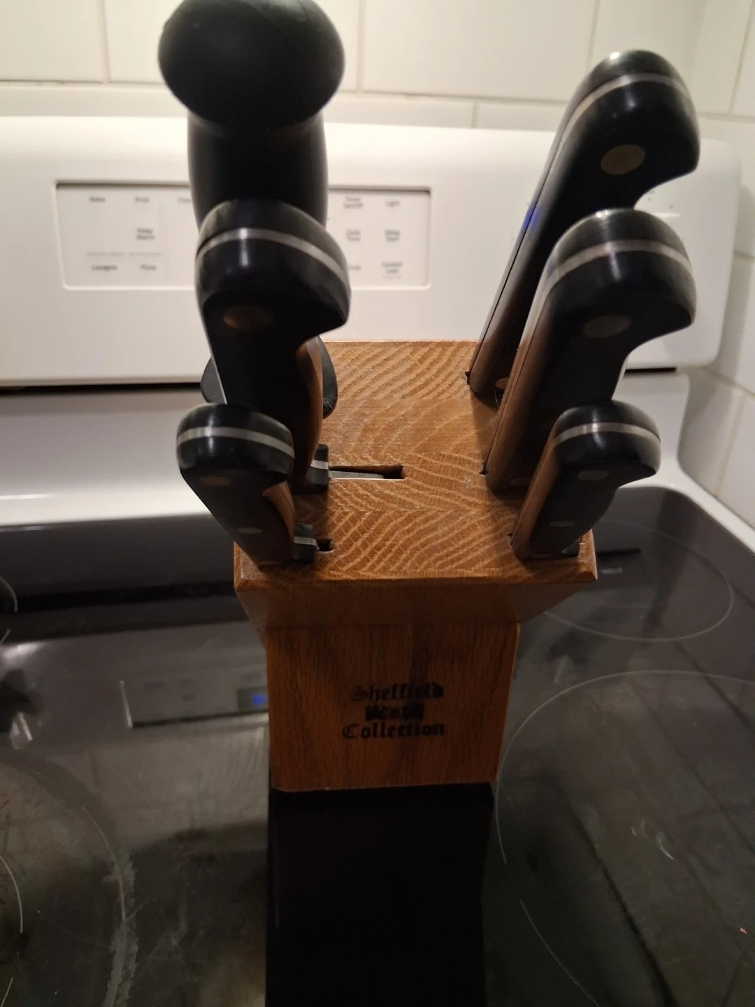 This is a knife set from the Sheffield Collection. It comes with a wooden block to store the knives. The handles are black with silver accents.