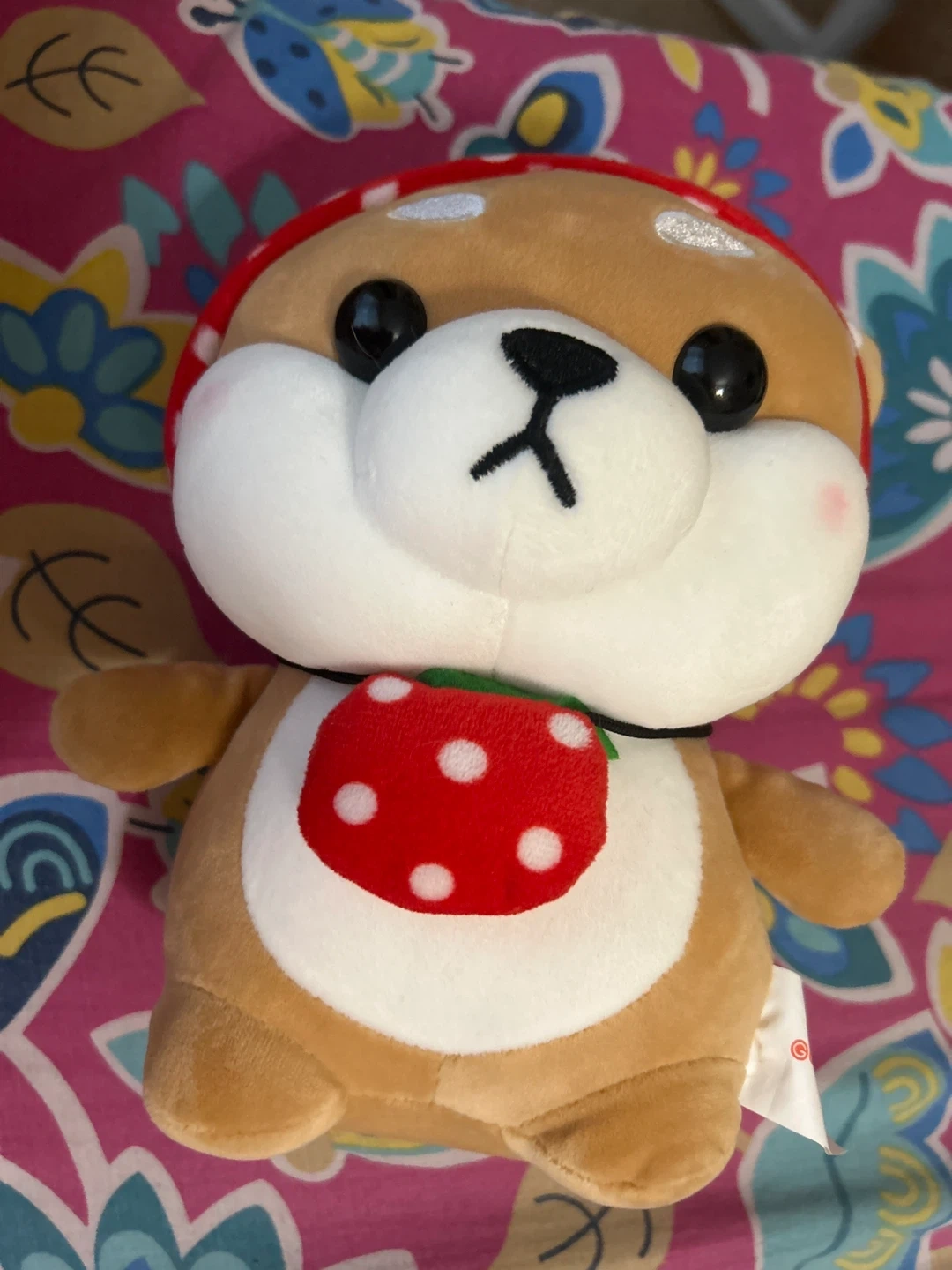 A cute plush toy with a red and white polka dot strawberry bib. It has a red mushroom-shaped hat with white spots. The plush is soft and cuddly.