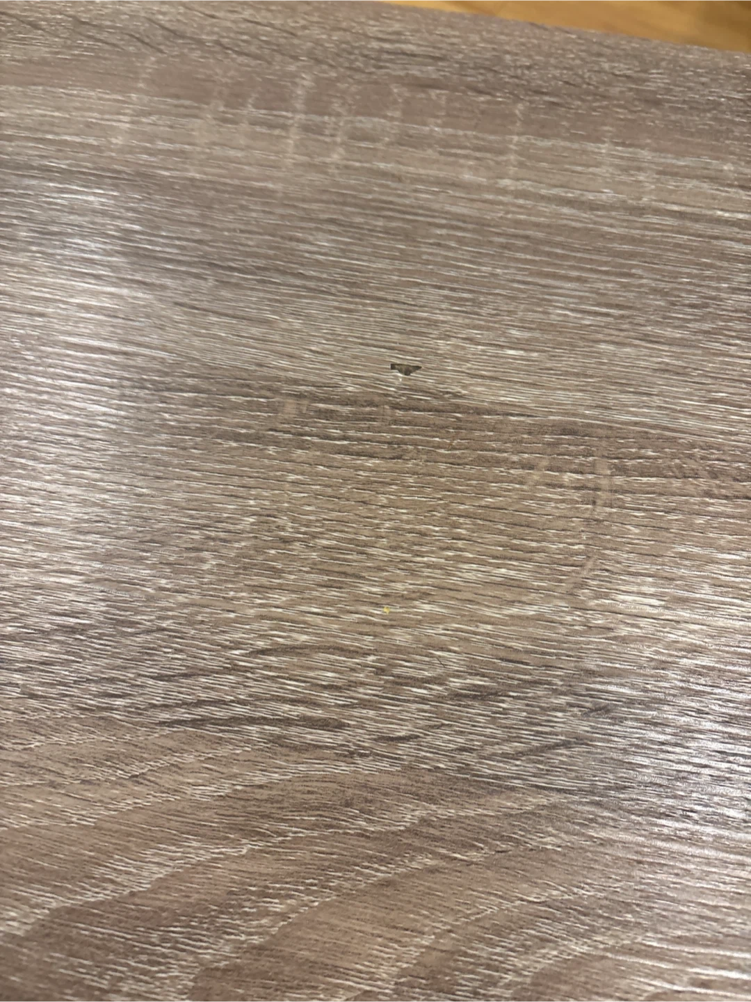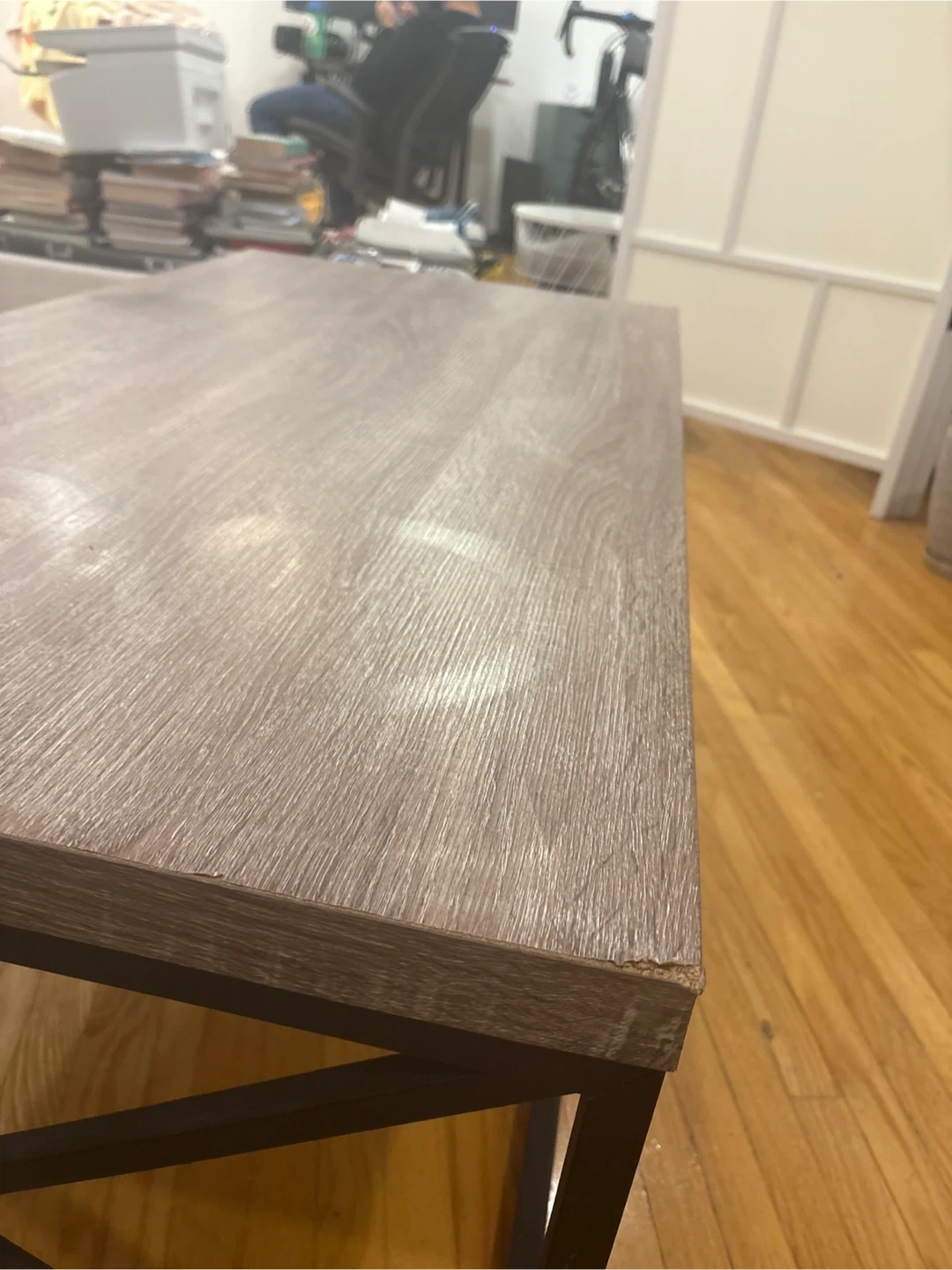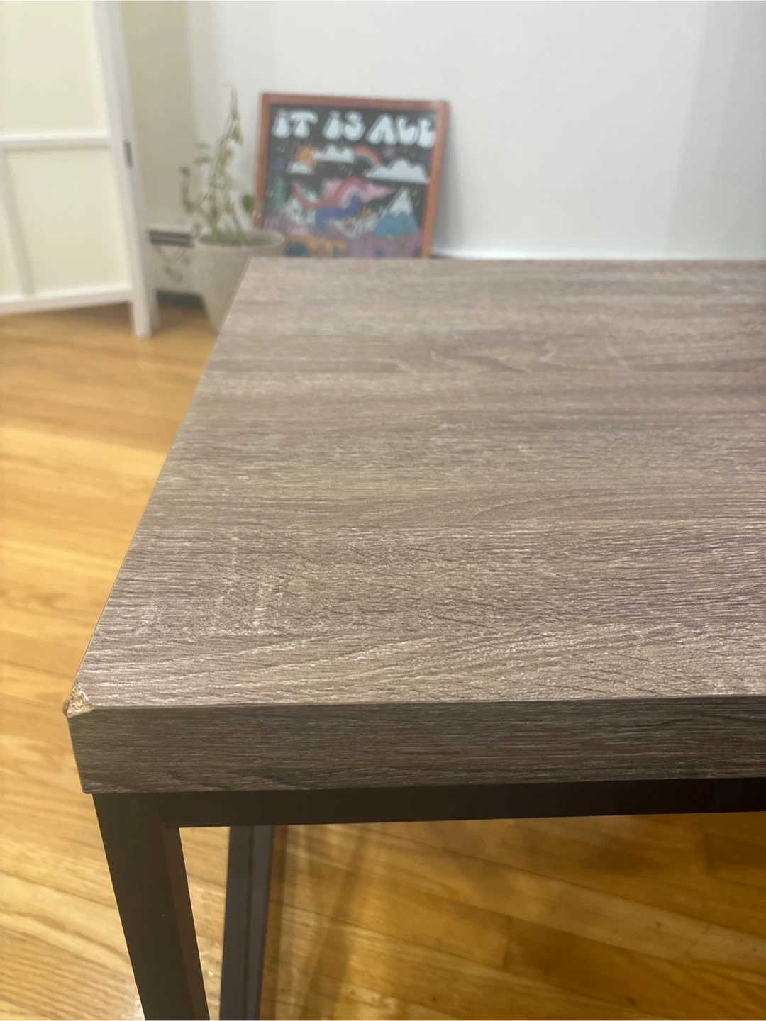 A basic coffee table which has a wood-look laminate top with a metal frame base. It's a great size for a living room. The corners show some minor wear from use. Size 120cm by 60 cm