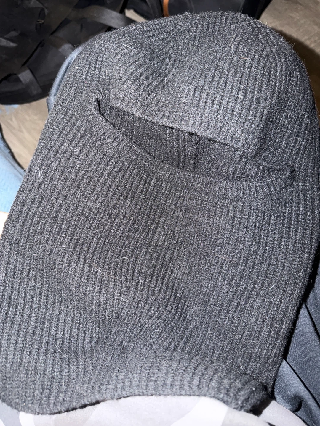 A black knit balaclava with eye openings. It's made of a ribbed knit material. Keep warm during colder weather!