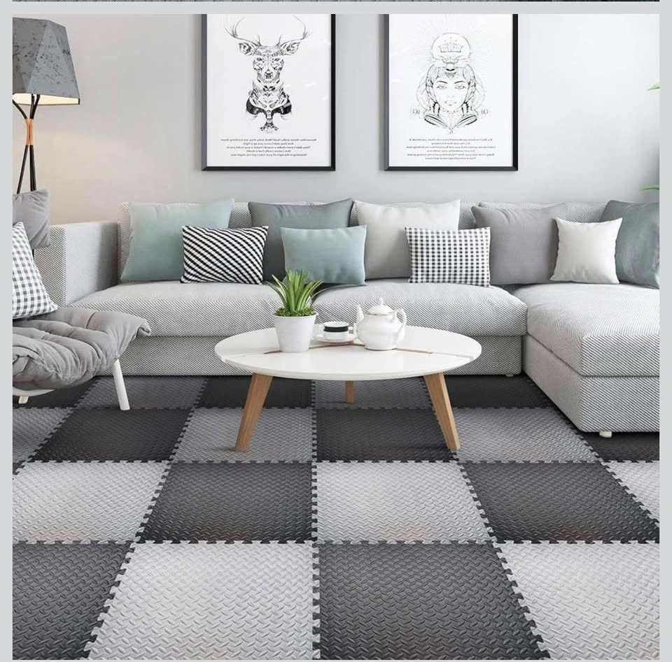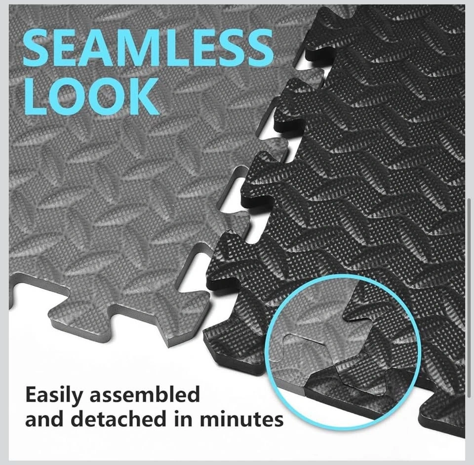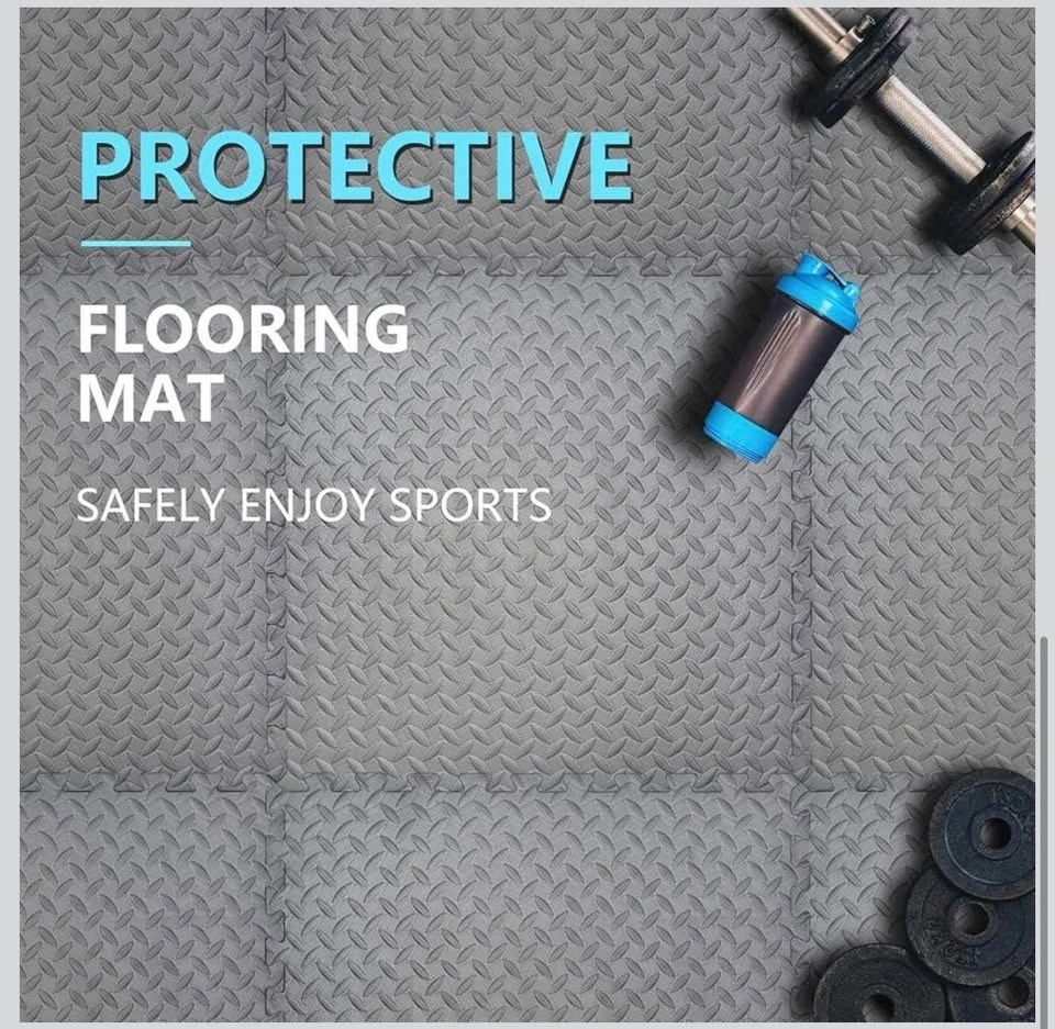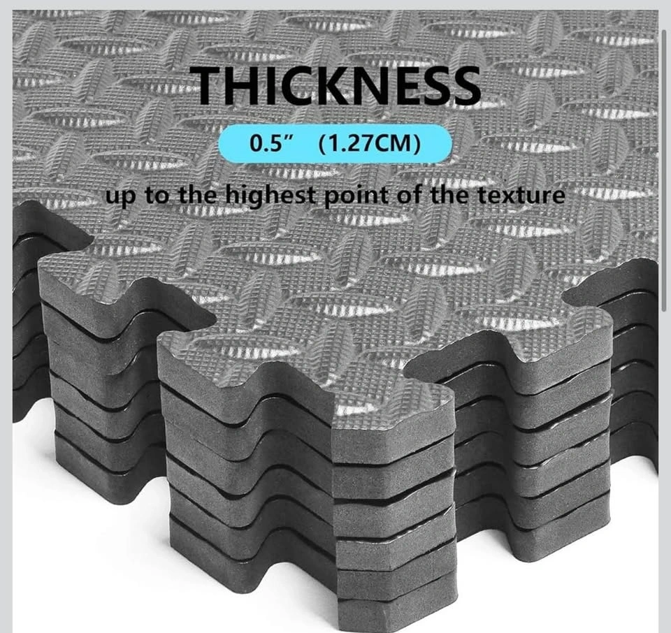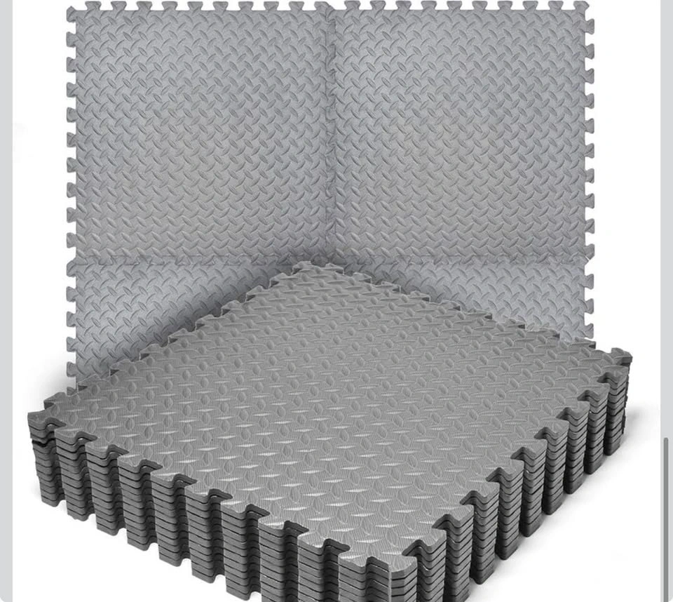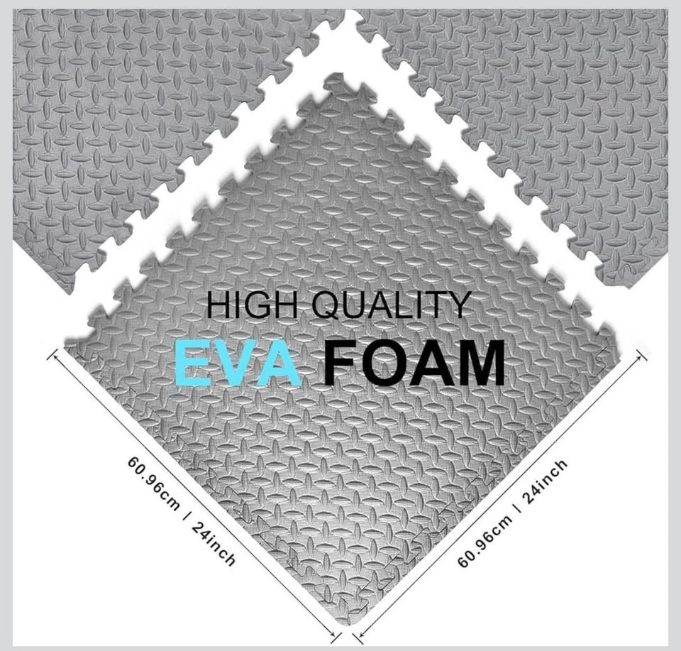 New interlocking gym floor tiles made of high-quality gray EVA foam. Each tile is 24 inches by 24 inches with a thickness of 0.5 inches. These mats have a diamond plate texture for anti-slip protection and provide shock absorption for home workouts. The set includes multiple pieces that fit together like a puzzle to protect floors from scratches and scuffs.