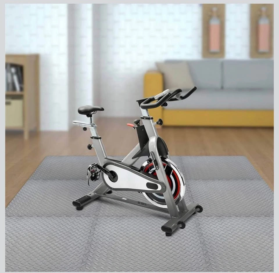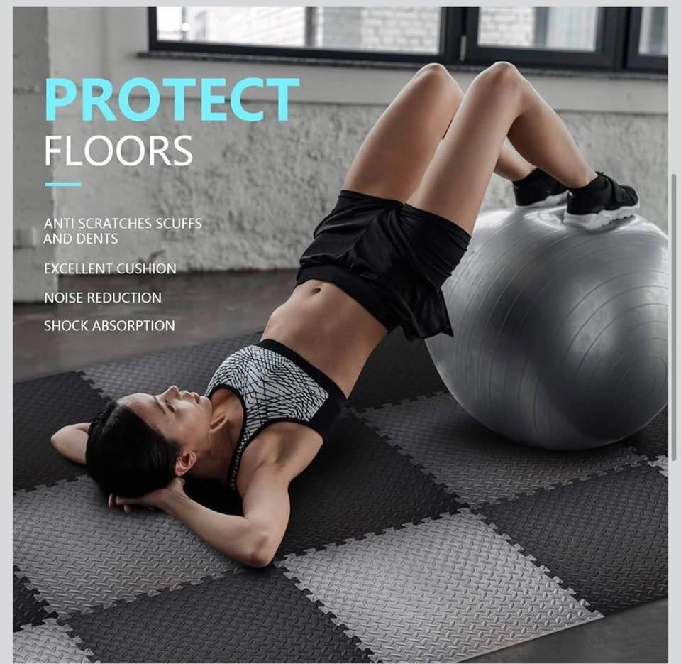 New interlocking gym floor tiles made of high-quality gray EVA foam. Each tile is 24 inches by 24 inches with a thickness of 0.5 inches. These mats have a diamond plate texture for anti-slip protection and provide shock absorption for home workouts. The set includes multiple pieces that fit together like a puzzle to protect floors from scratches and scuffs.