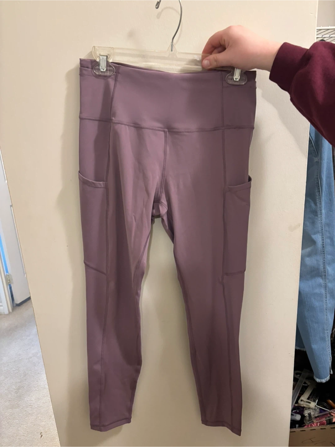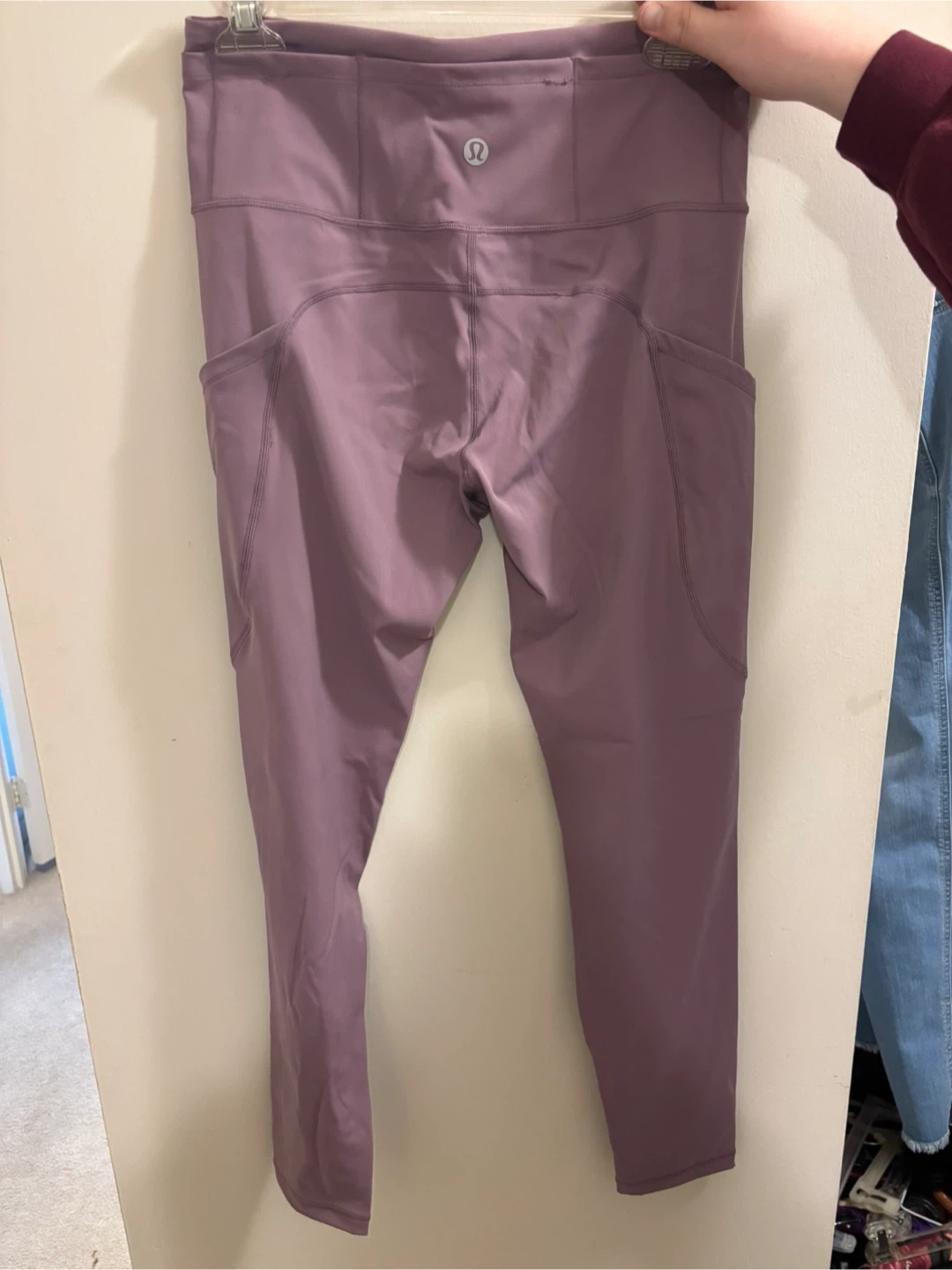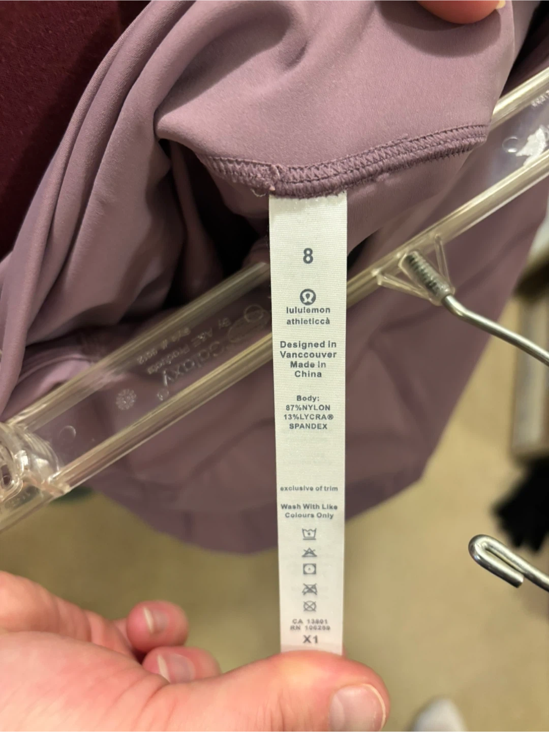 These Lululemon Athletica leggings are size 8. They're made from a blend of 87% nylon and 13% Lycra spandex. Pockets are on both sides.