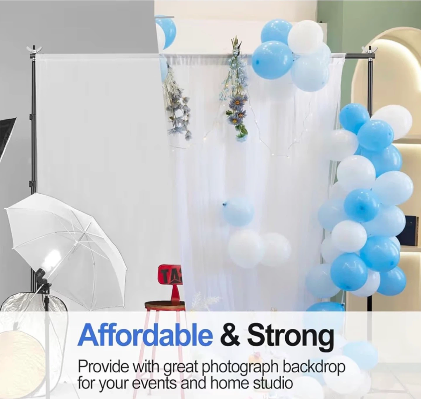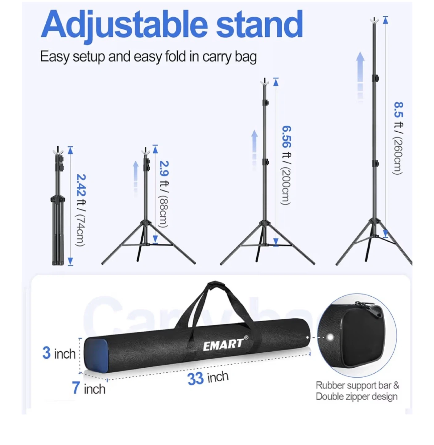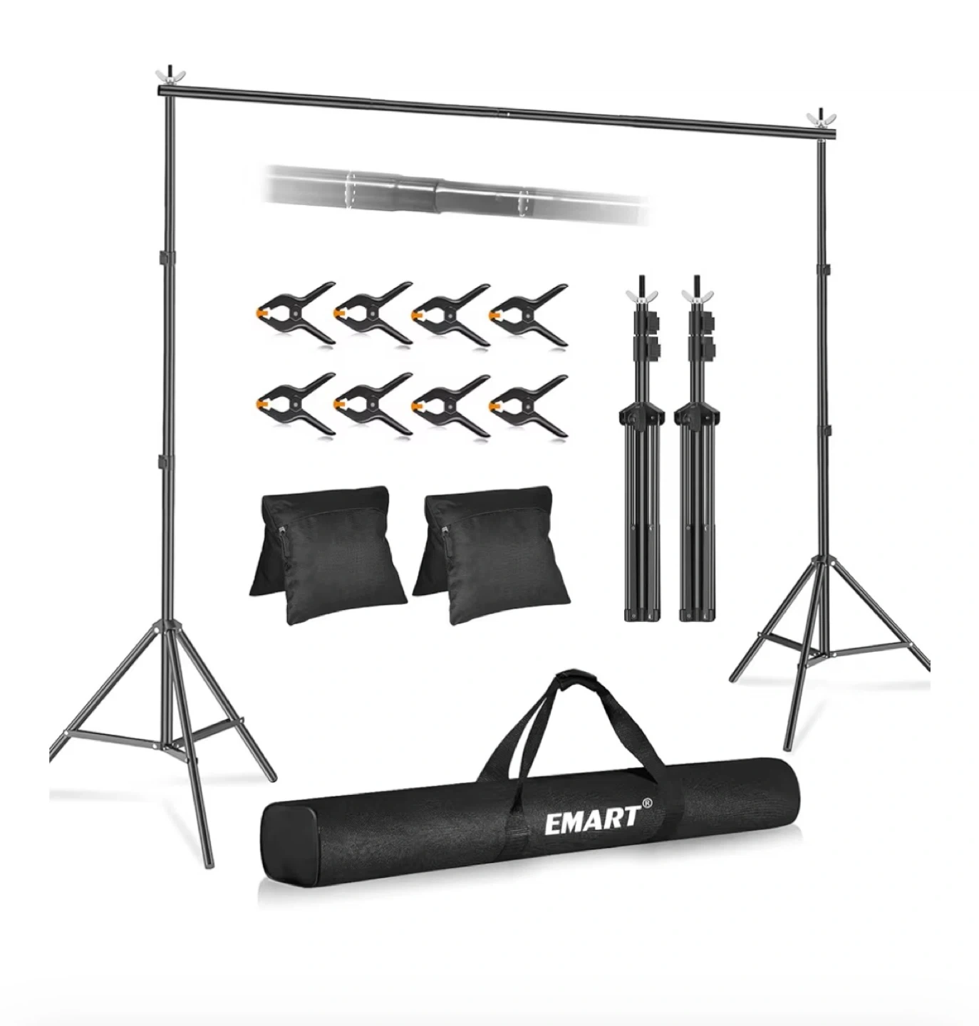 This EMART backdrop stand kit includes two tripod stands and one crossbar. It's adjustable in height from 2.9ft to 8.5ft and width from 5.3ft to 10ft. The kit comes with 8 clamps, 2 sandbags, and a carry bag for easy transport. It's perfect for photo studios, events, or home use!