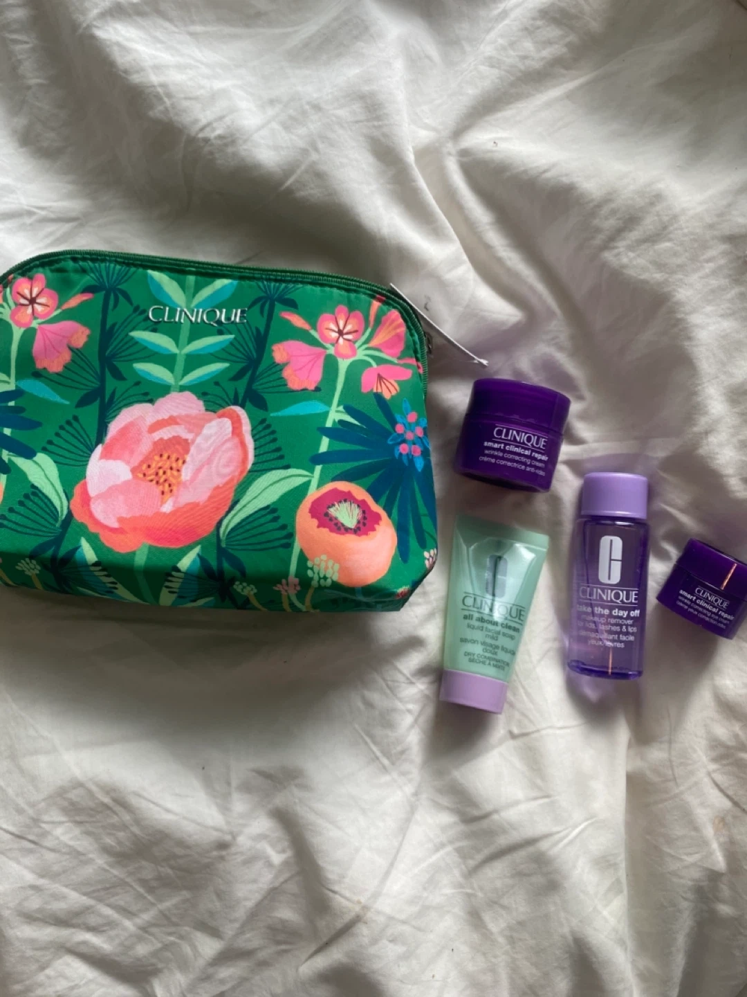 This unused Clinique minis set collection includes Take The Day Off makeup remover, All About Clean liquid facial soap, two jars (15ml and 0.5ml) of Smart Clinical Repair wrinkle correcting cream, and cosmetic bag. Useful for travel or trying out popular Clinique products!