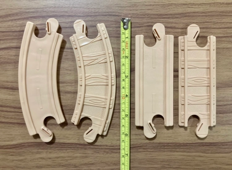 Lot comes with tunnels, trees, buildings, train vehicles and cargo; and lots of different shapes and sizes of tracks, can be joined together in endless ways