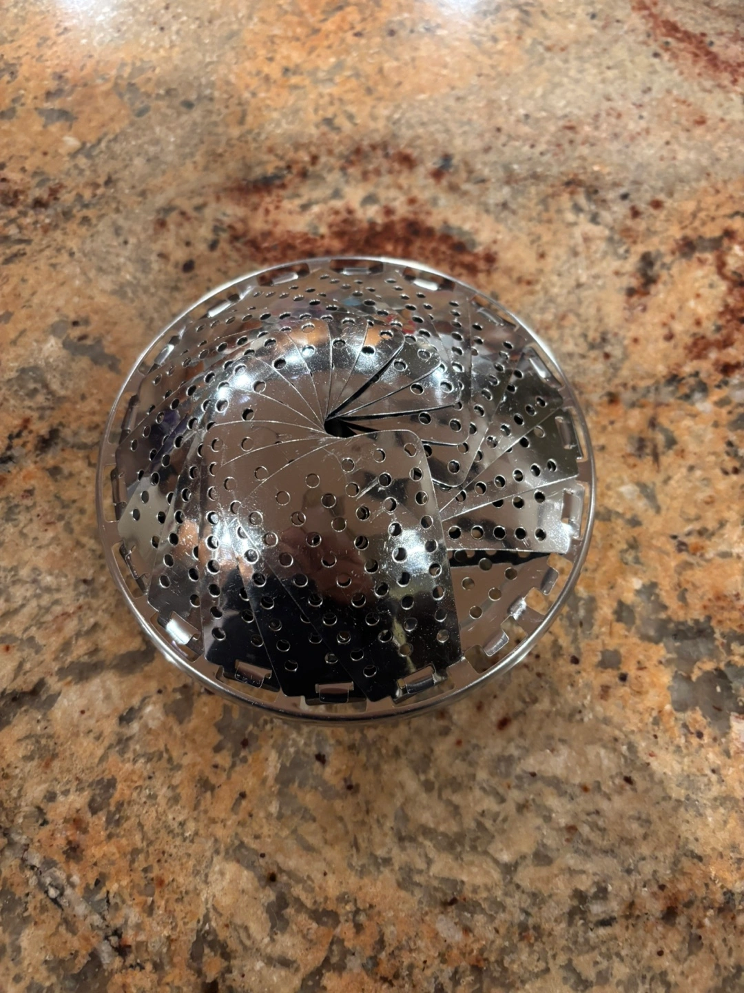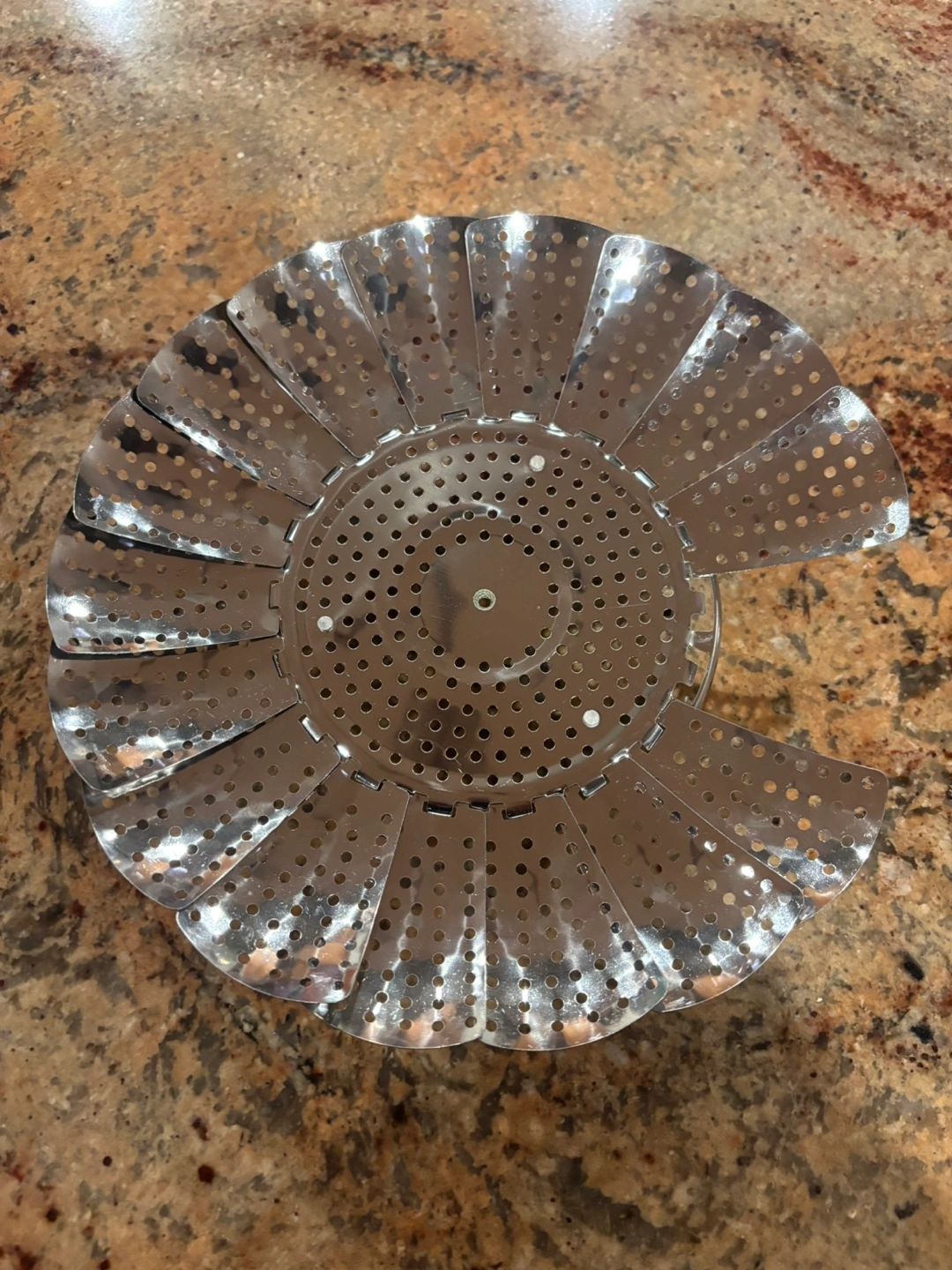 This is a handy collapsible steamer basket. It's made of stainless steel and expands to fit different pot sizes. A great way to steam your veggies!