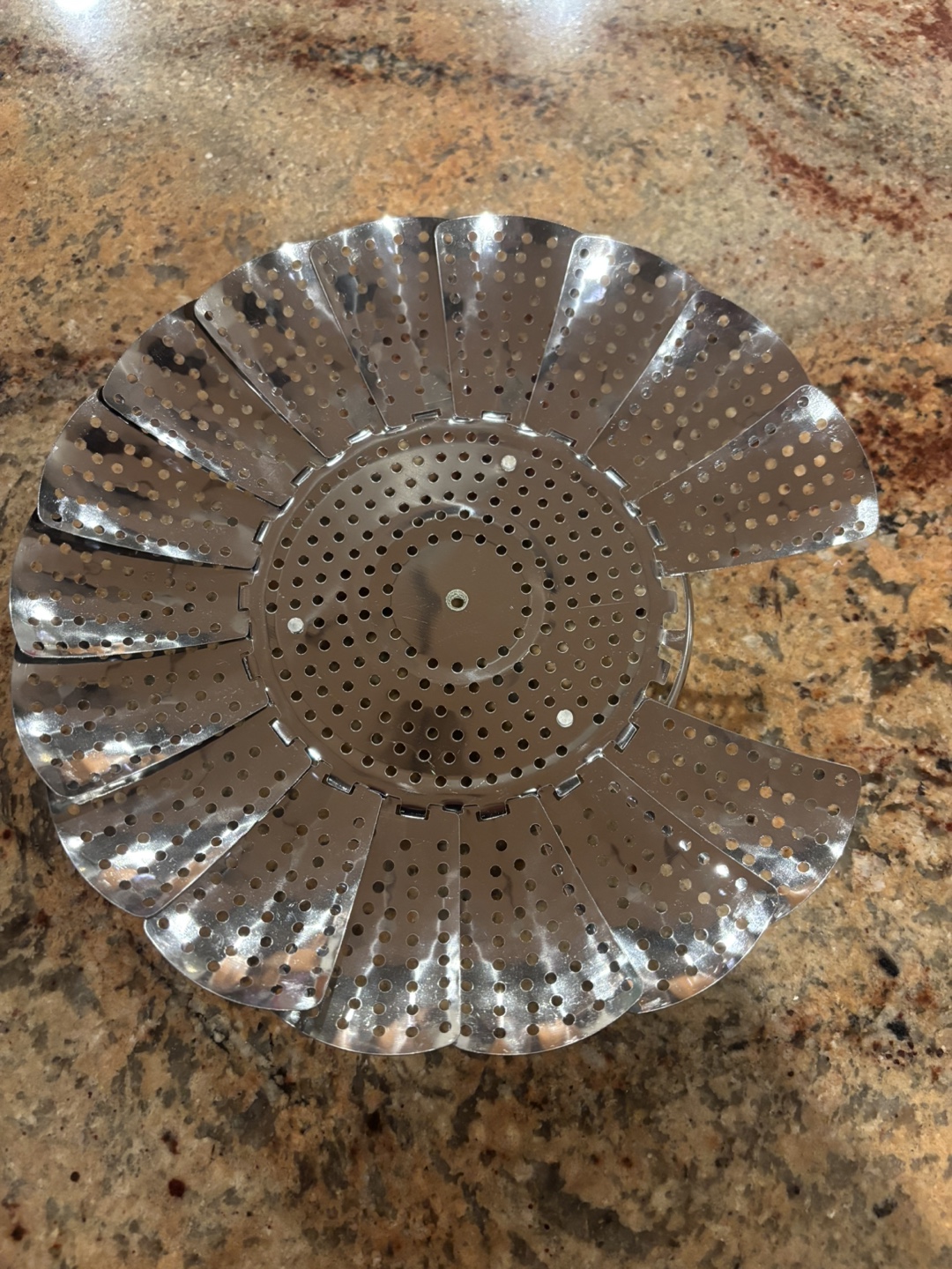 This is a handy collapsible steamer basket. It's made of stainless steel and expands to fit different pot sizes. A great way to steam your veggies!