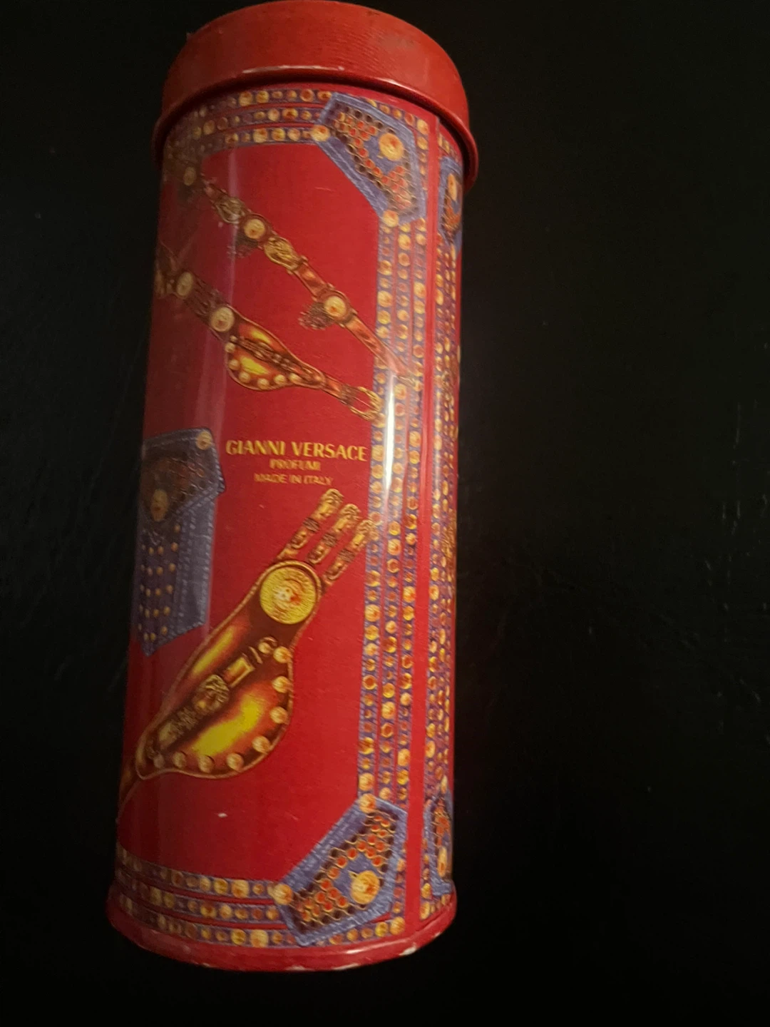 This is vintage early 1990s Versace ran jeans, metal container, tin
