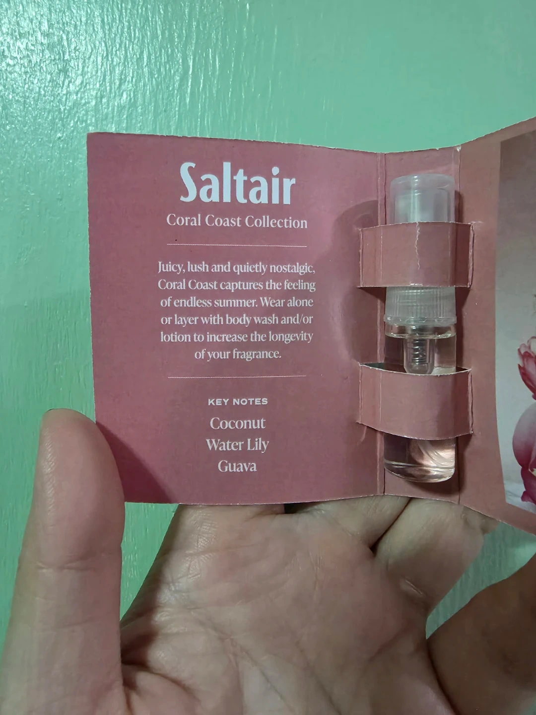 This sampler features Saltair's Coral Coast Fine Fragrance Mist in a convenient 3ml size. Advertised as body mist. Key notes include coconut, water lily, and guava. It's perfect for trying out the scent before committing to a larger bottle!