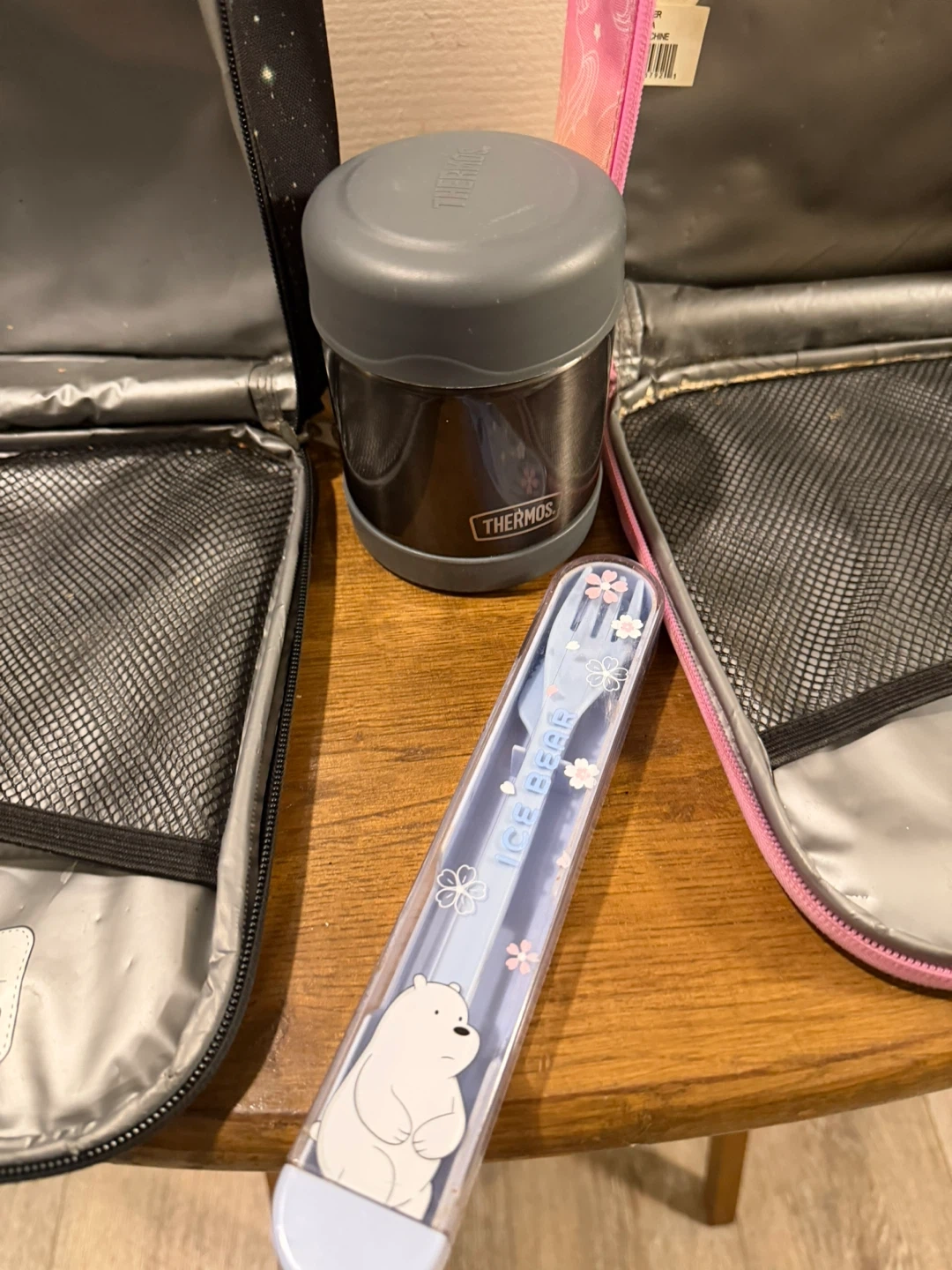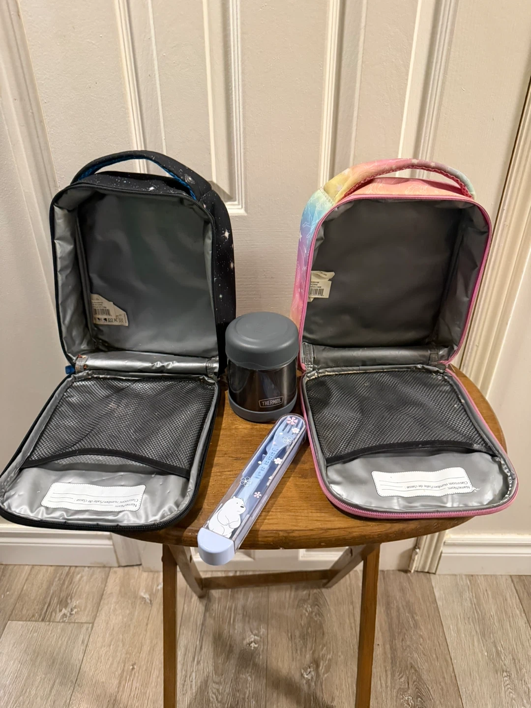 Two insulated lunch bags, one with a galaxy print and the other with unicorns and rainbows. Includes a grey Thermos food jar and a blue utensil set with a bear design. Great for packing warm or cold lunches!