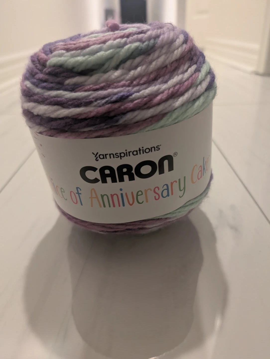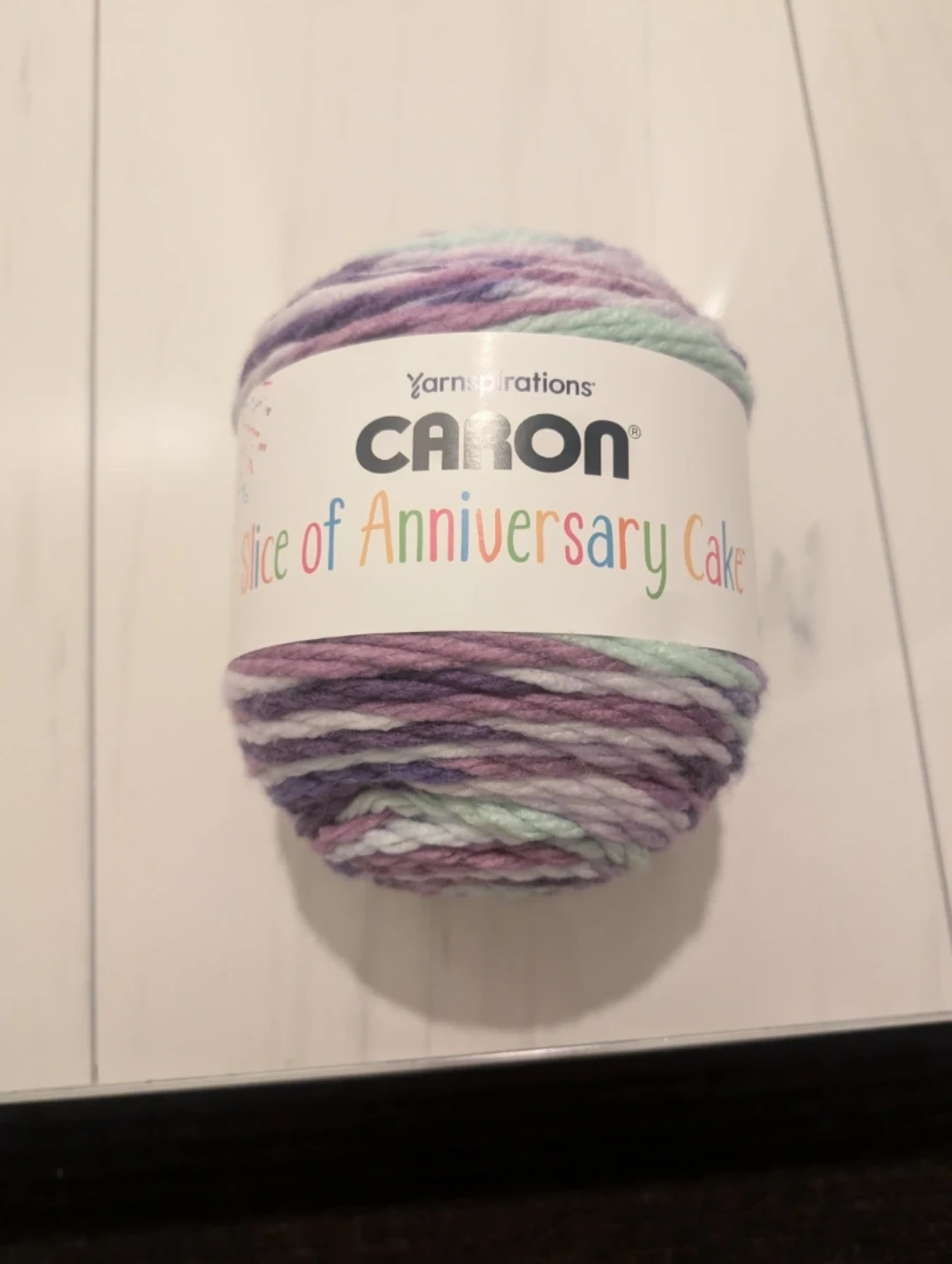 This is a Caron Anniversary Cake yarn. It's a blend of purple, white, and light green colours. Perfect for your next knitting or crochet project! Cash only please.