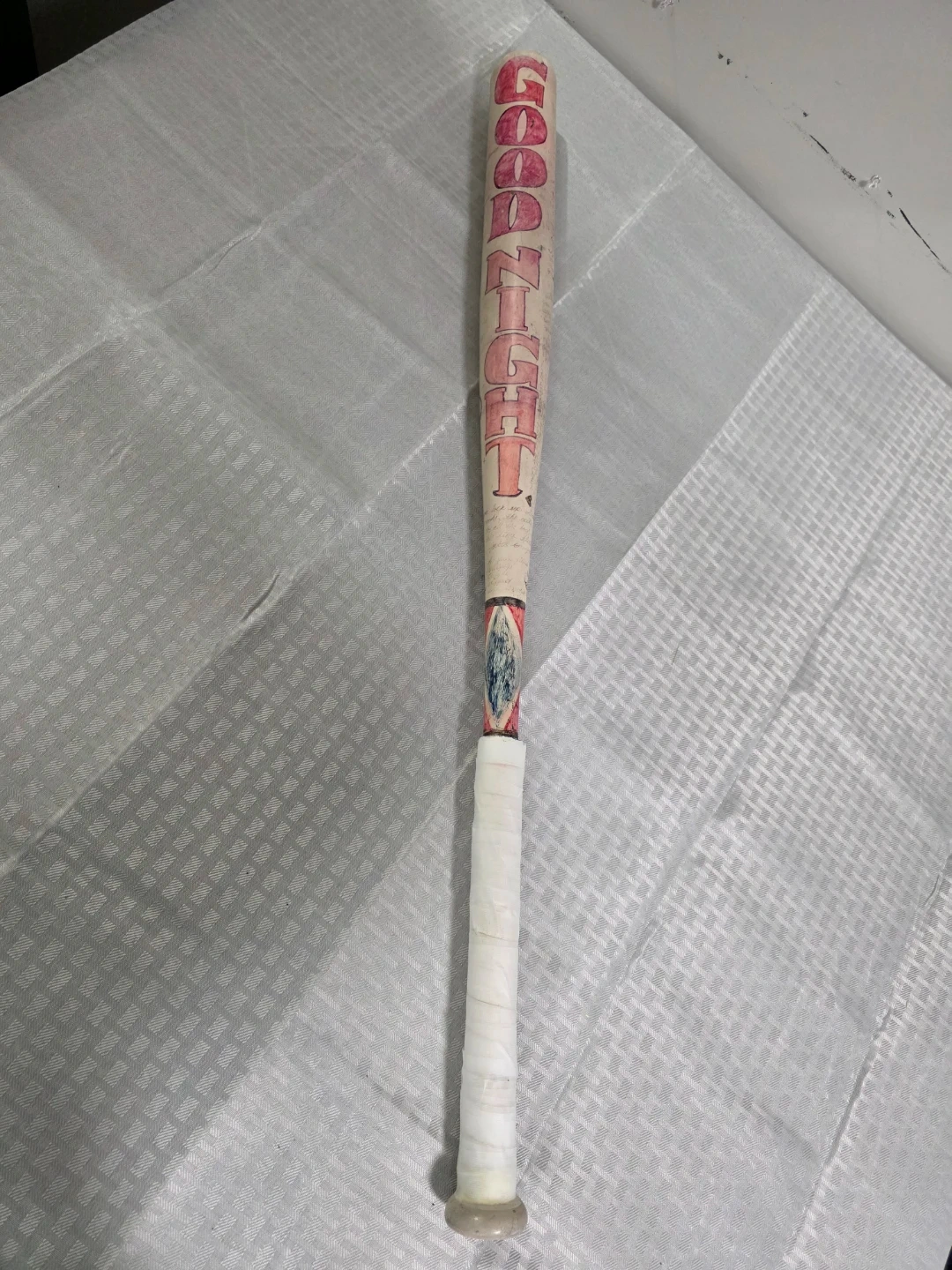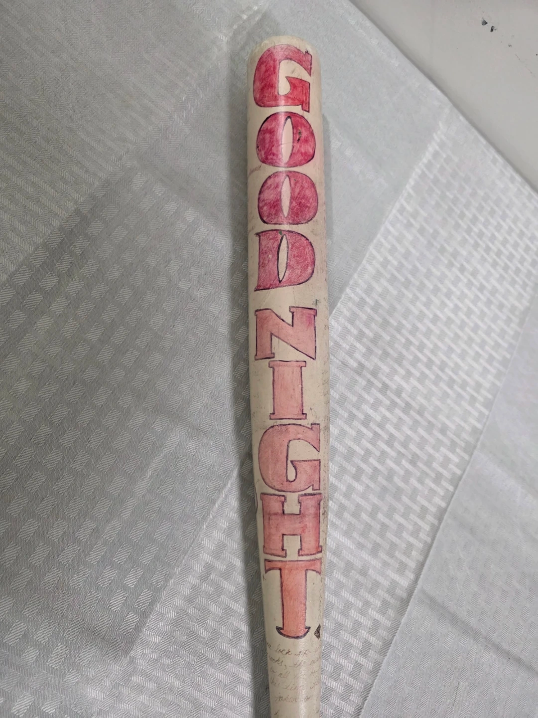 This baseball bat has custom "GOOD NIGHT" lettering on it. It's ready for batting practice or display. A great item for collectors!