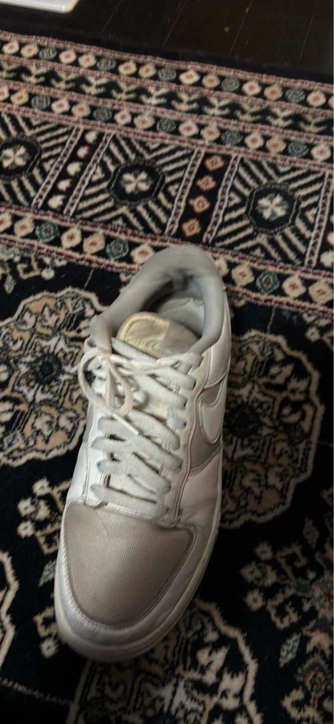 White leather Nike Air Force 1 sneakers. These shoes feature a classic design with the iconic Nike swoosh and "AIR" branding on the midsole. They're made of leather with textile accents. A comfortable choice for everyday wear!