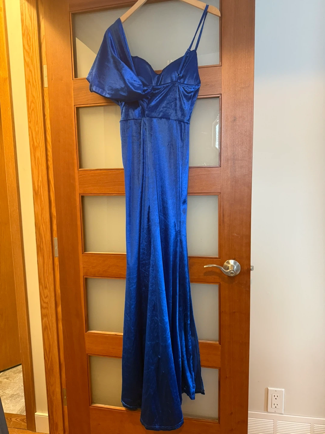 This stunning royal blue maxi dress features a chic one-shoulder design and a flattering ruched waist. It has a sophisticated high leg slit for added flair. It's perfect for formal events and parties!