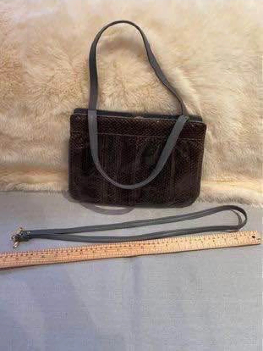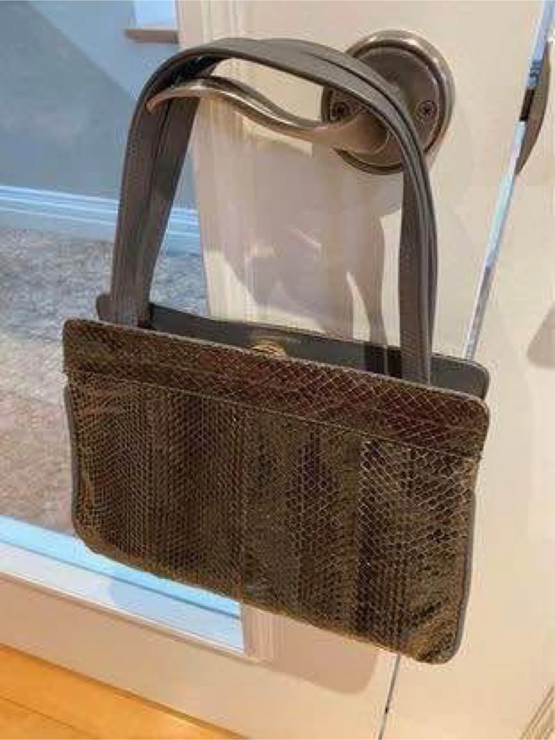 A classic top handle handbag featuring a unique snakeskin exterior with grey leather accents. It has a secure clasp closure and a spacious interior. This bag's sophisticated design makes it suitable for dressy occasions.