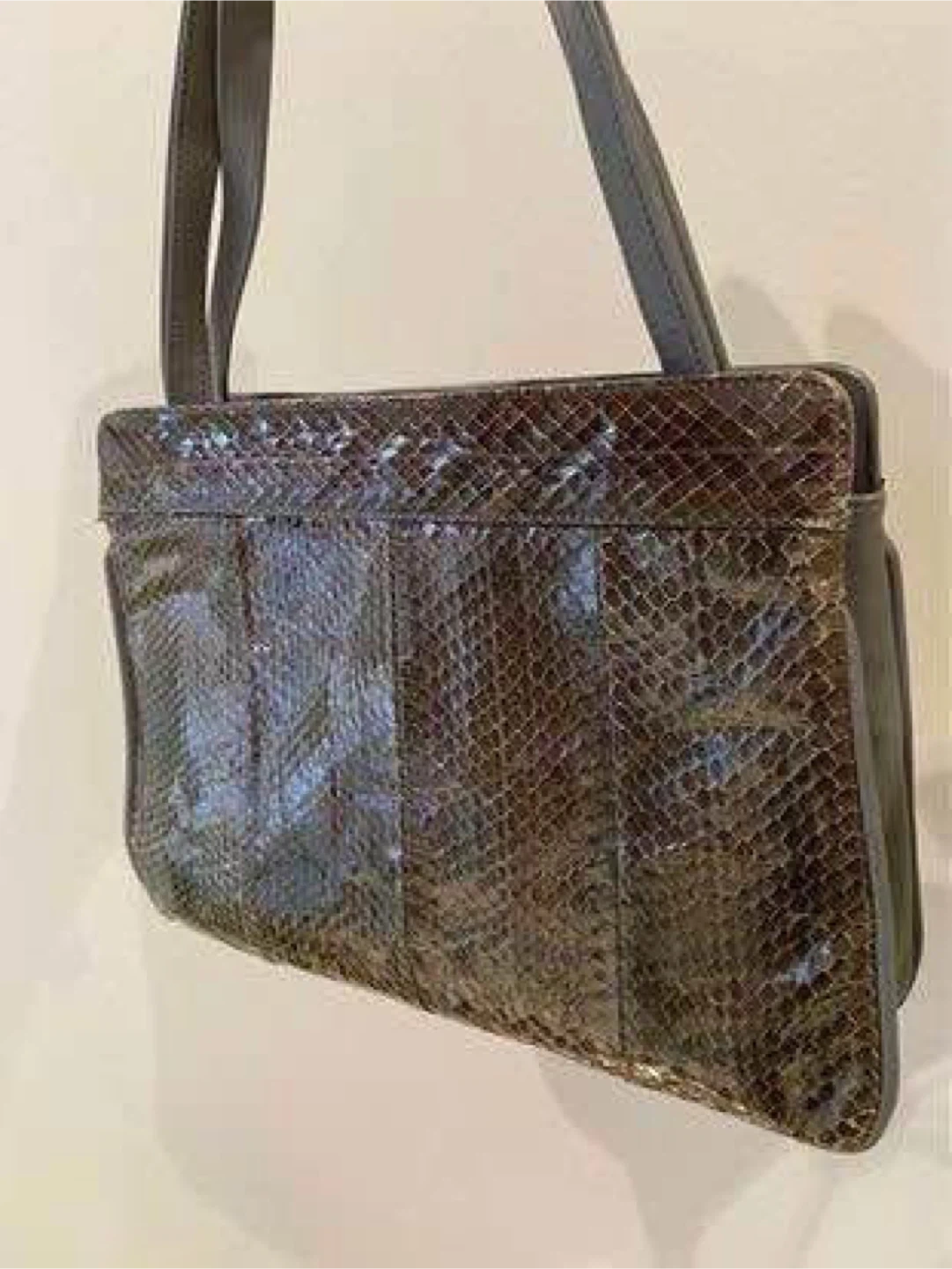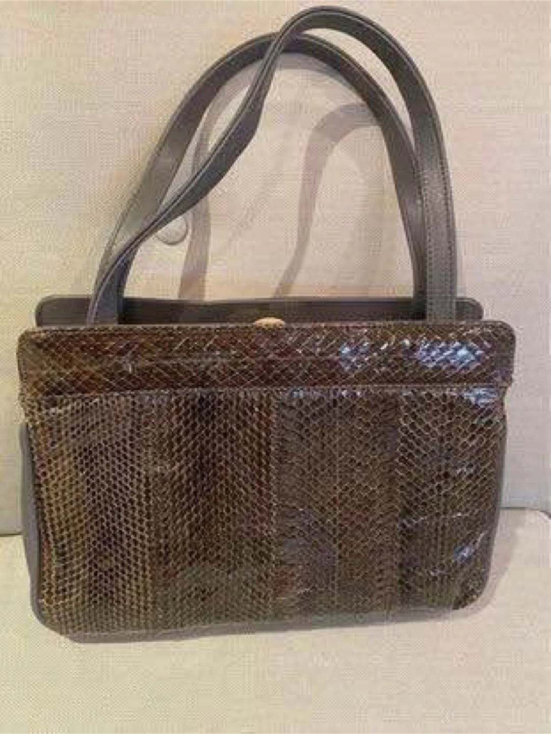A classic top handle handbag featuring a unique snakeskin exterior with grey leather accents. It has a secure clasp closure and a spacious interior. This bag's sophisticated design makes it suitable for dressy occasions.