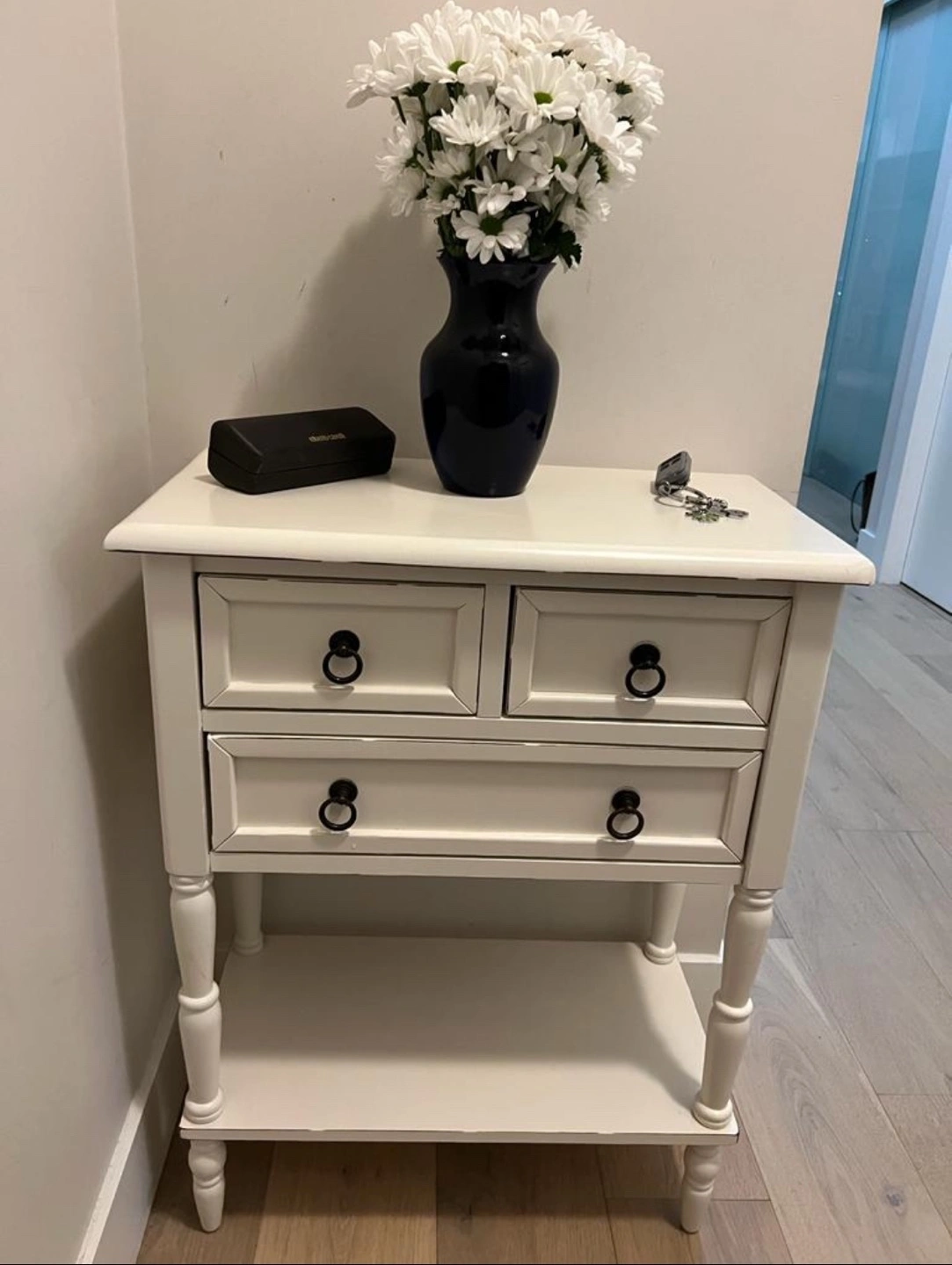 Charming white accent table. Three drawers with brass ring pulls. Turned legs. Small bottom shelf. Excellent for entryway or living room.