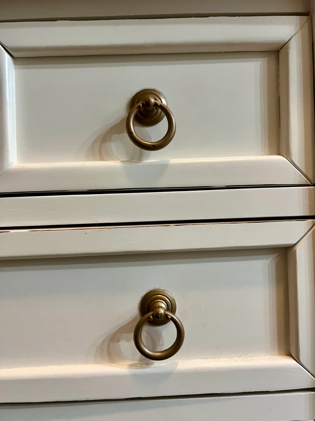 Charming white accent table. Three drawers with brass ring pulls. Turned legs. Small bottom shelf. Excellent for entryway or living room.
