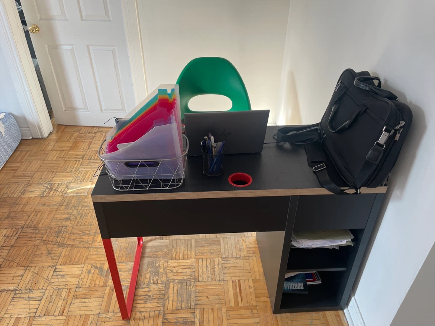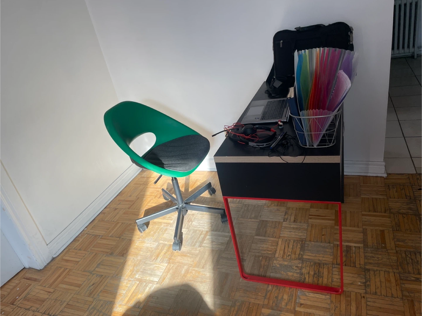 Selling an IKEA Micke office desk + IKEA Swivel office Chair. The desk has a black top, red legs, and built-in storage. Great for a home office or student space. The top corner of the table is slightly chipped off but the overall table/quality is in great shape.