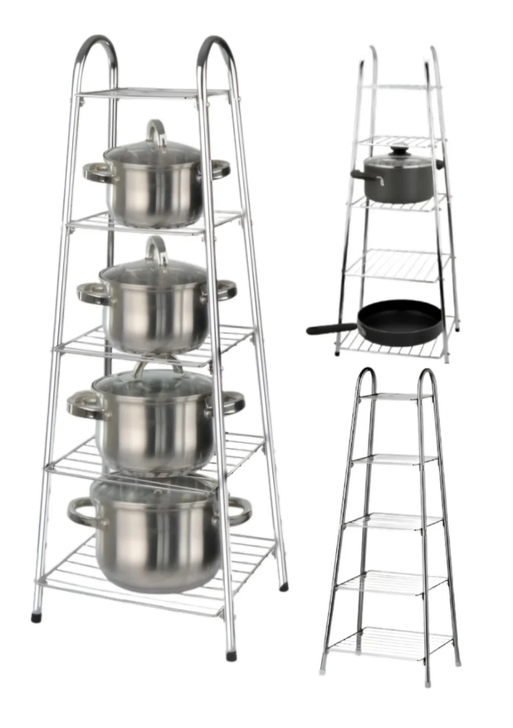 This product is a 5 Tier Kitchen Pan Stand and Storage Organizer designed to organize pots and pans in a compact, vertical space.
