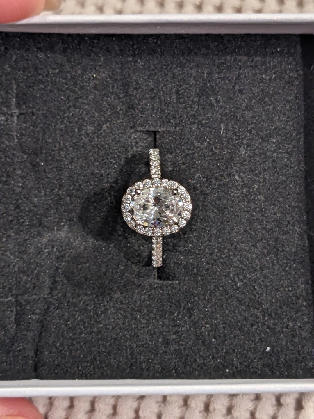 Beautiful oval halo ring featuring a central 1.5CT Cubic Zirconia stone surrounded by smaller accent stones. The ring is crafted from 925 sterling silver. Brand new, only worn to try on. Size 5. Price is firm.