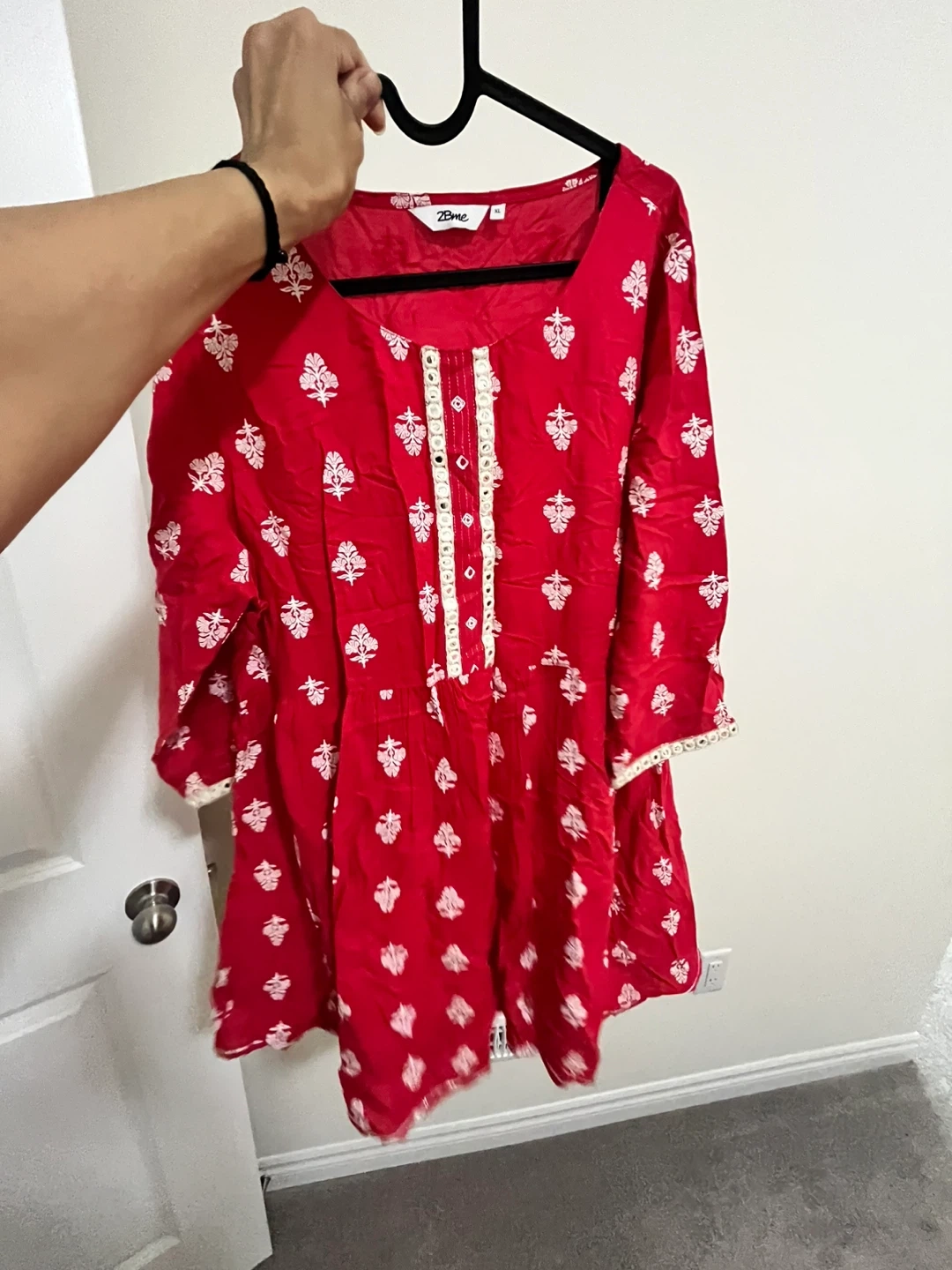 This is a cute 2Bme tunic top! It's red with a white floral pattern. Perfect for adding a pop of colour to your wardrobe
