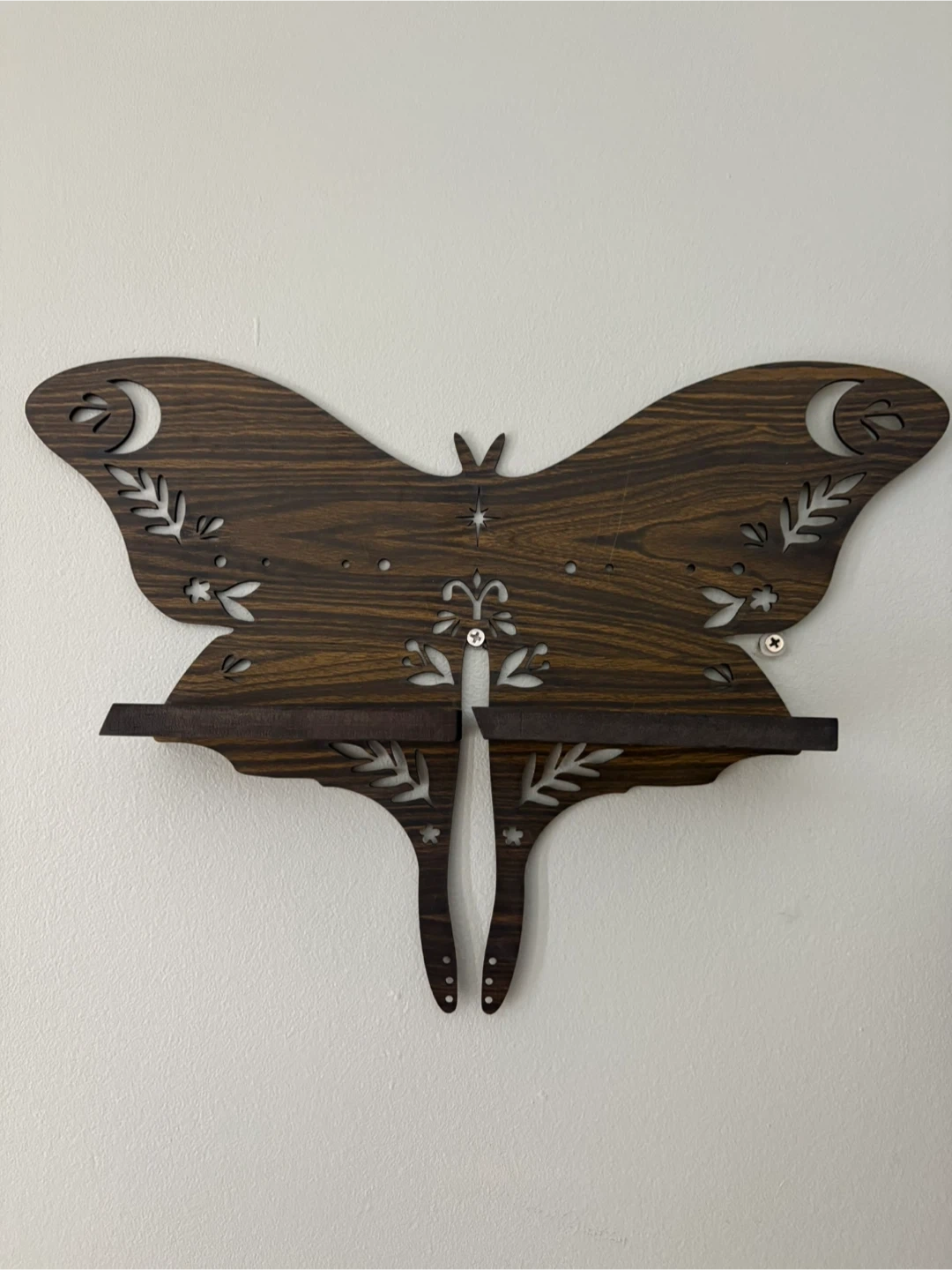 A cute butterfly-shaped wall shelf, perfect for adding a touch of whimsy to any room! It's made of wood and features a unique design with cut-out details.