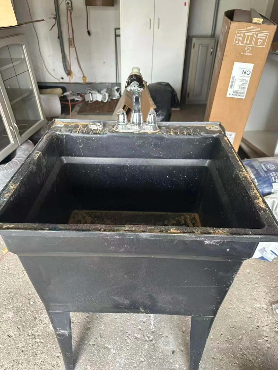 This is a black utility sink with an attached faucet. It's a sturdy sink made of durable plastic. Great for laundry rooms or garages! 24x24 inch
