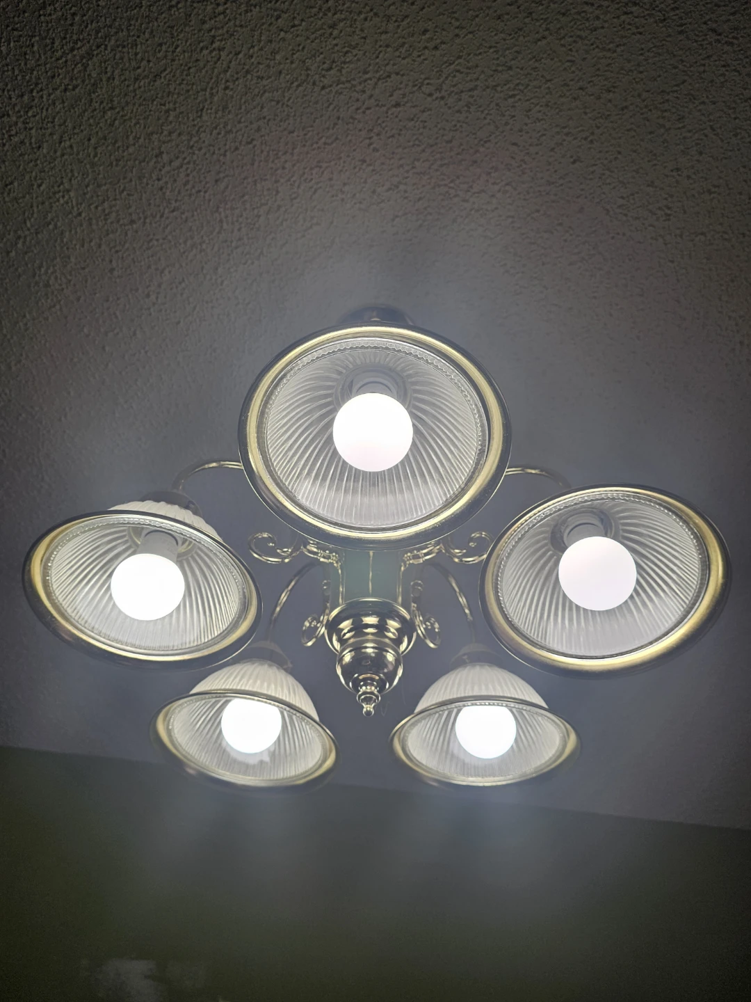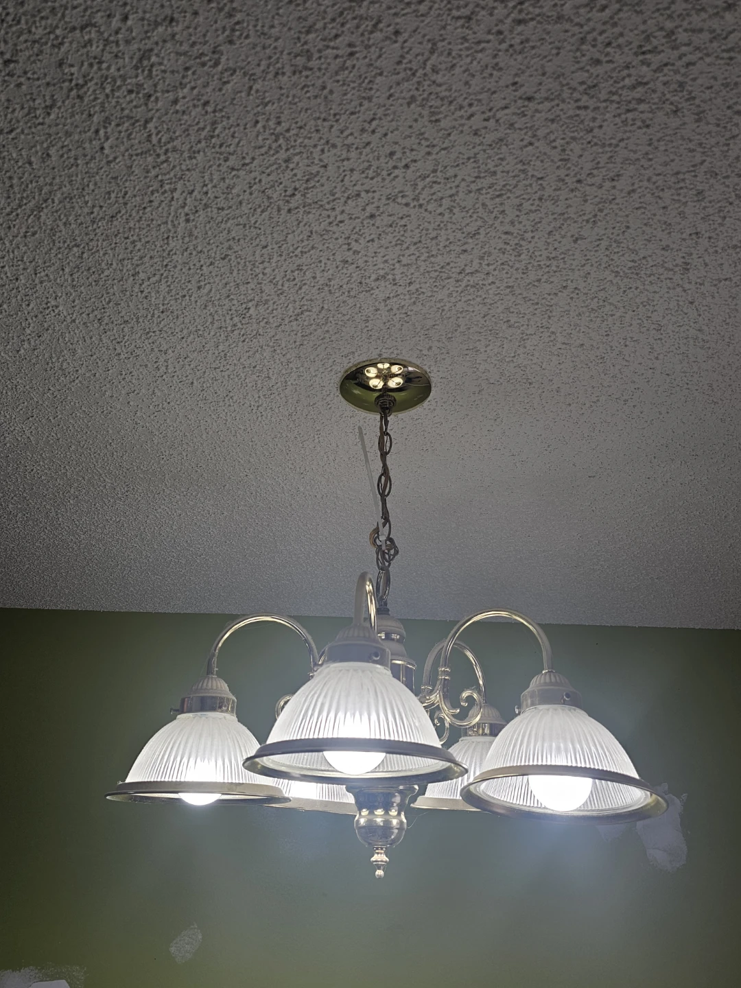 This is a gold trim chandelier with five frosted glass shades. It's a classic fixture that would brighten up any room. This would be great for a kitchen or dining room area. Uses standard light bulbs. Overall diameter 221/2", drop is variable according to your preferences.