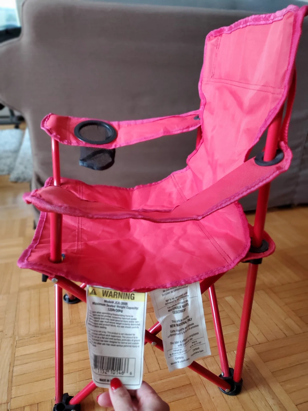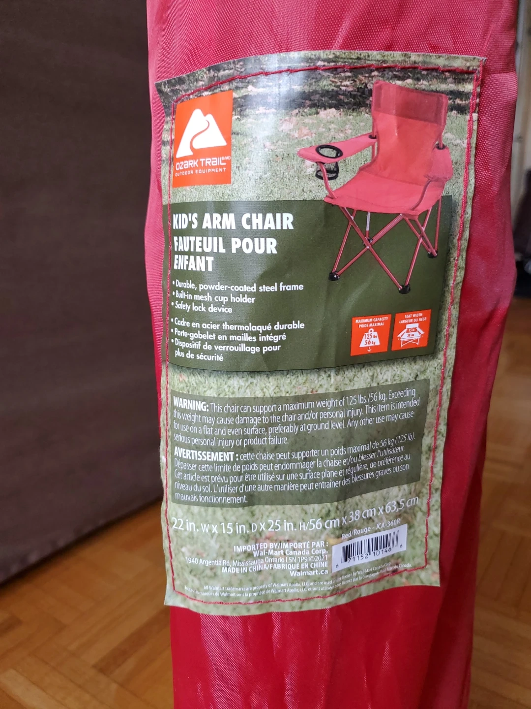 This is a red Ozark Trail kid's arm chair. It's hardly ever used. It features a durable, powder-coated steel frame and a mesh cup holder. It is foldable, and comes with a bag. Lightweight easily carried and transportable.