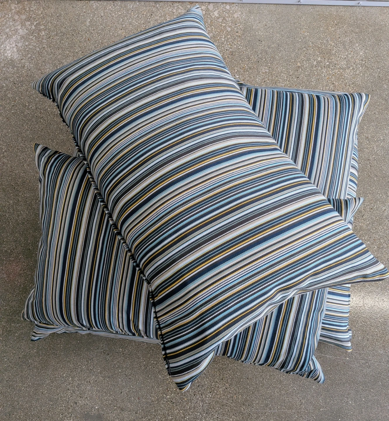 Set of 5 decorative pillows with a striped pattern in shades of blue, white, and yellow.