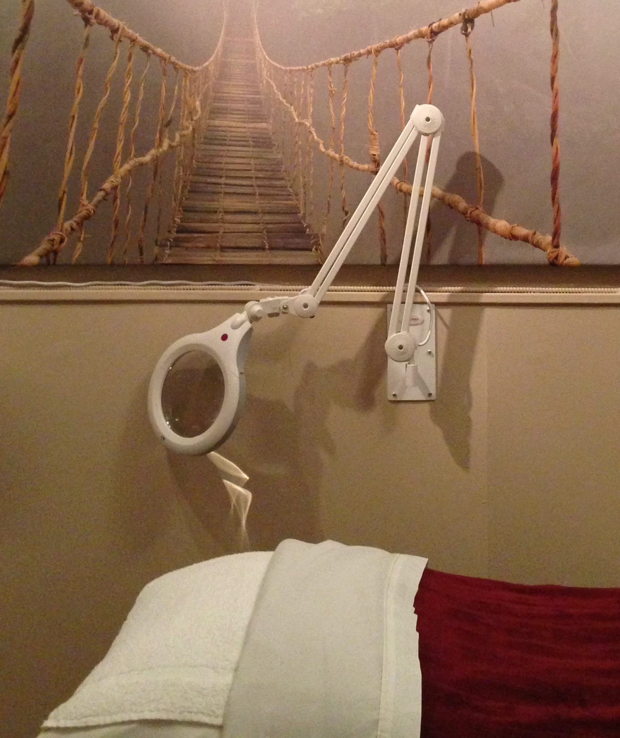 Wall-mounted with adjustable arm and bright light + magnification for facials, skincare, lash work, or detailed treatments.
